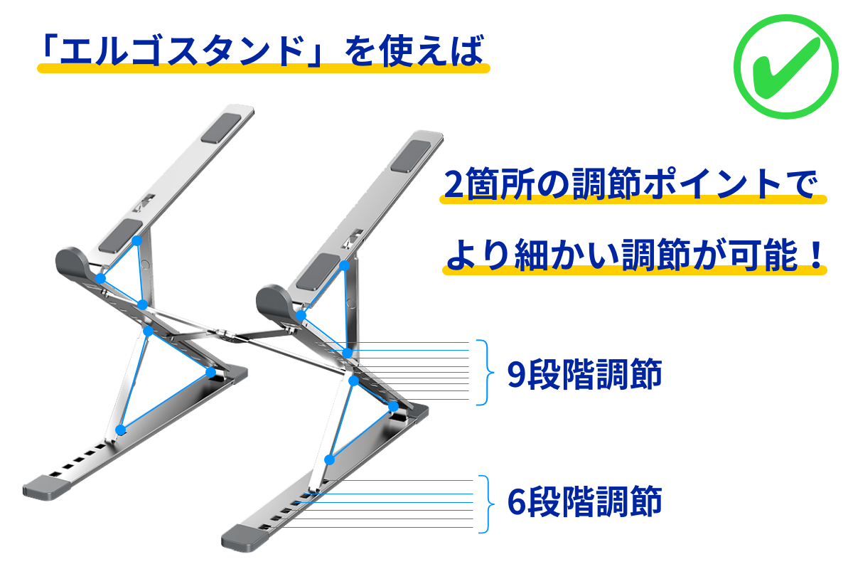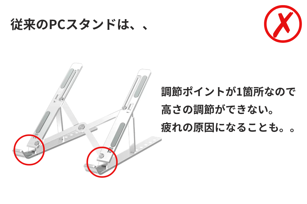 『エルゴスタンド』は従来の1箇所の調節ポイントを持つスタンドと違い、2箇所の調節ポイントを実現しました!