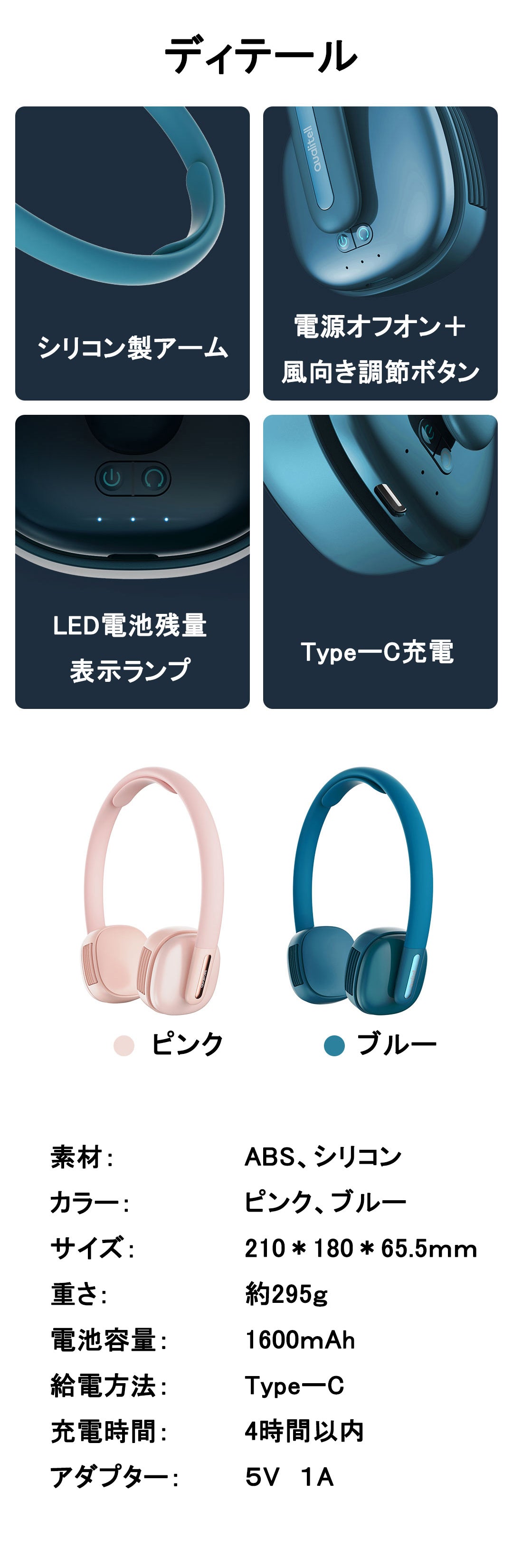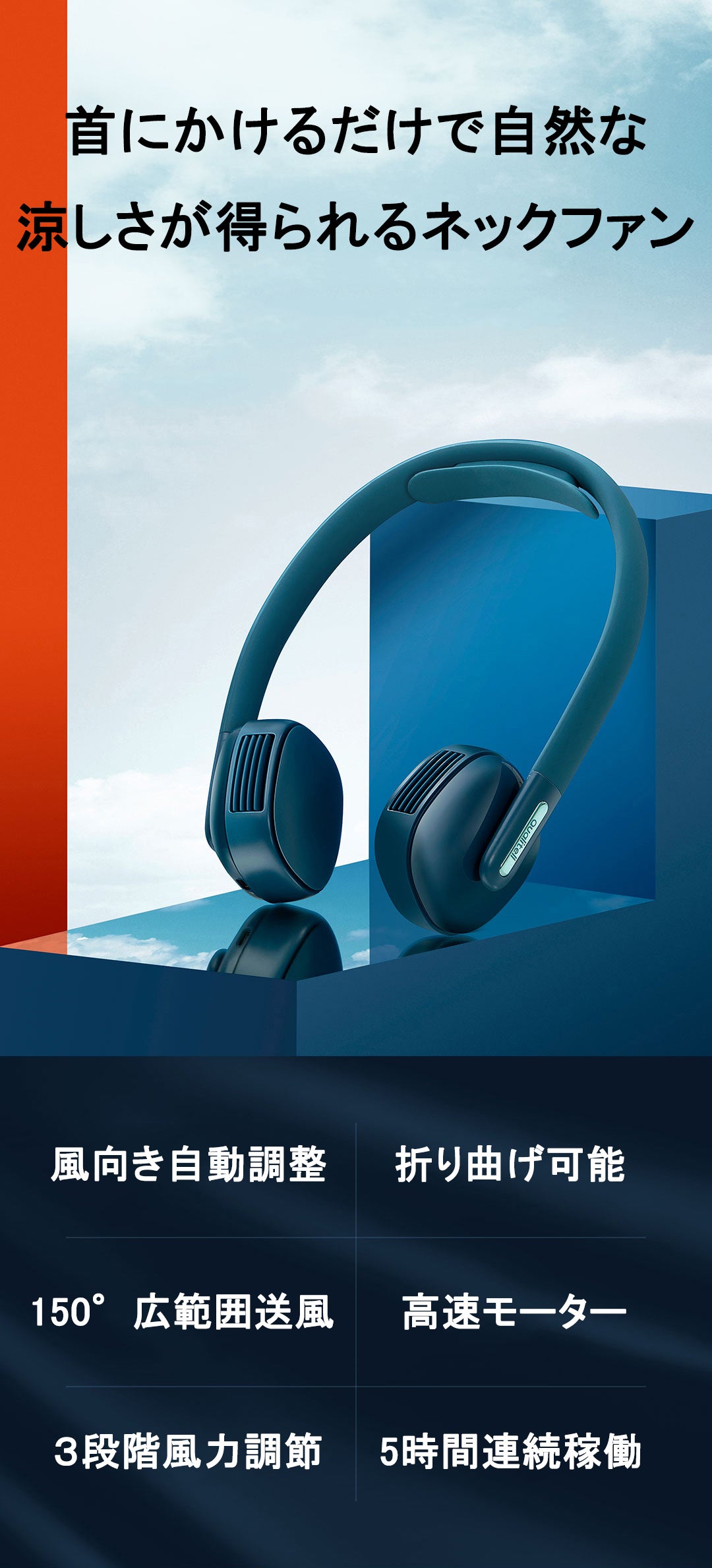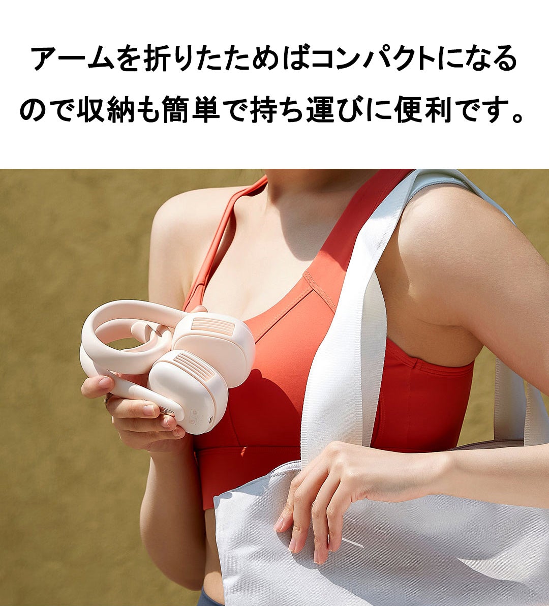 アーム部分は360度調整可能なやわらかいシリコン素材を採用し、自分の最適な角度に合わせて、風向きを自由自在に調整できます。風が出てくるファンが上下45度に調整可能です。ヘッドホンのように首にかけるだけで使用できるため両手が自由に使え、角度を調整すれば自分にぴったりの位置で涼しい風を楽しめます。