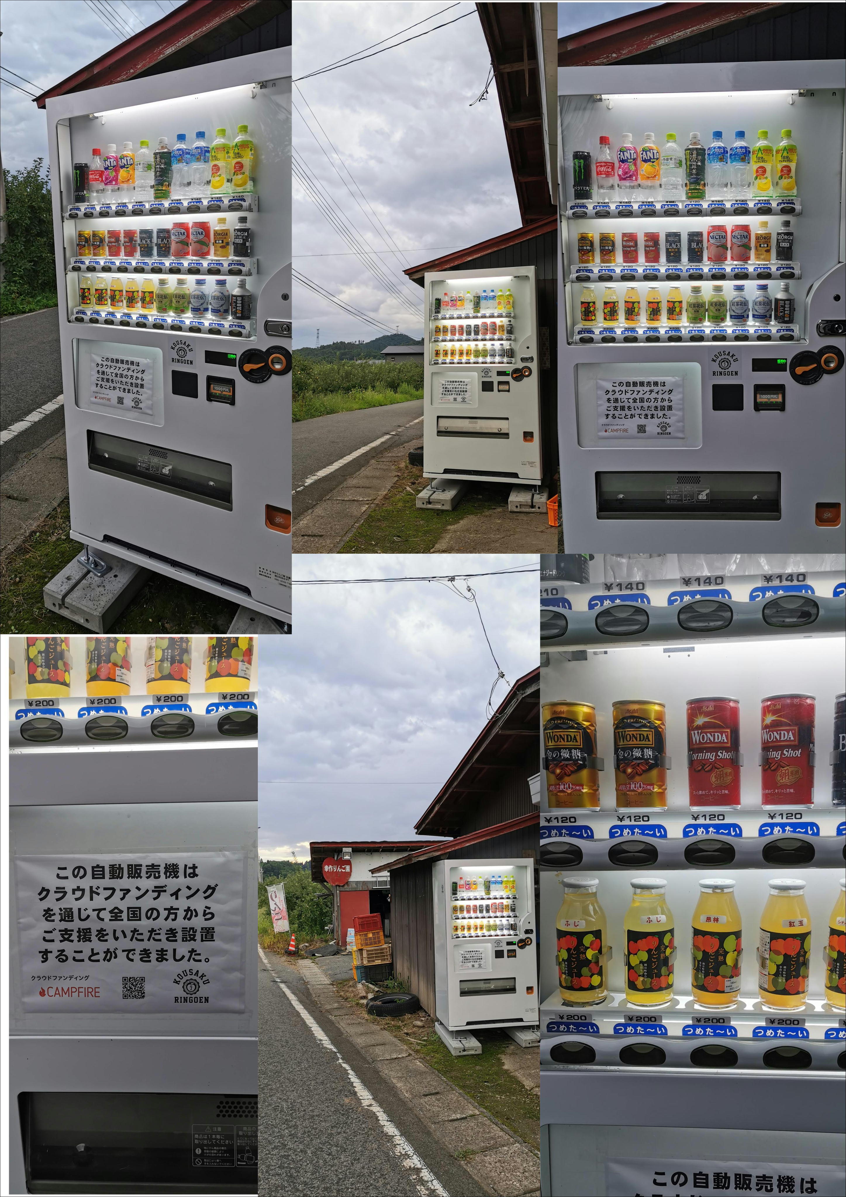 自販機無事設置なされたようで、おめでとうございます。 ベンダーを利用した無人販売の取り組みの例も多くありますので、 こんごの幸作りんご園さんの商品展開も期待しています(*´ω`*)