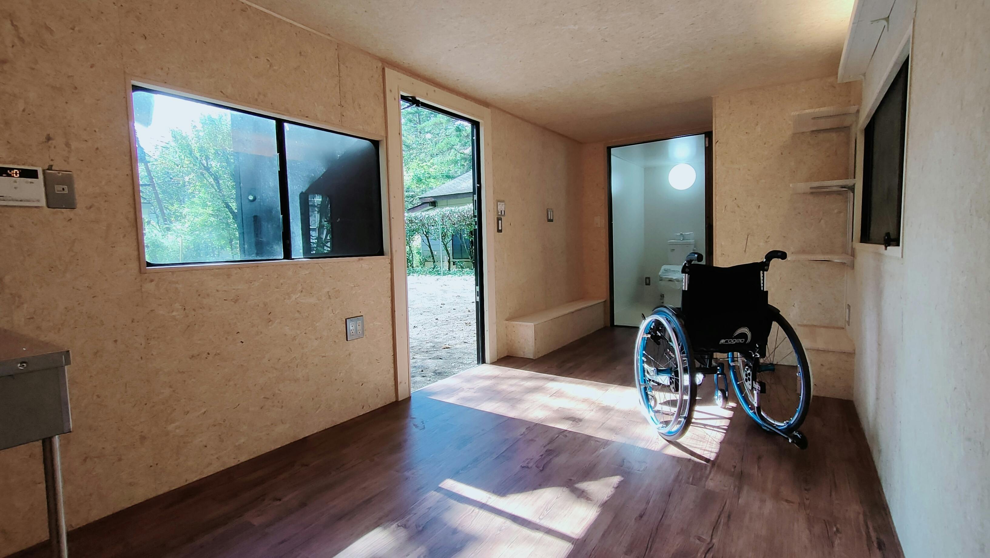 入口も幅を大きくしたことで車椅子で出入りがしやすくなりました。水回りは車椅子で転回できる計画で、これからトイレ用手すりやシャワーカーテンなどを設置する予定です。