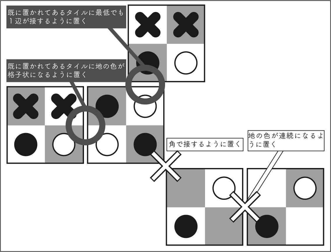 それ以降の手番は交互に既に配置されているタイルに接するように配置します。