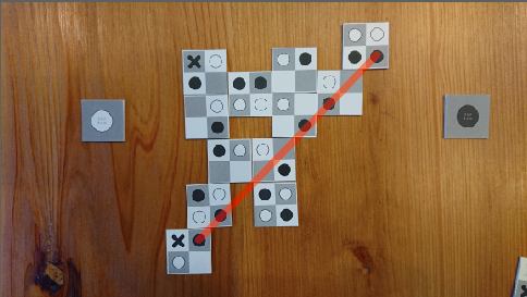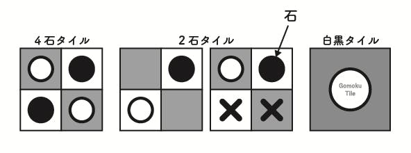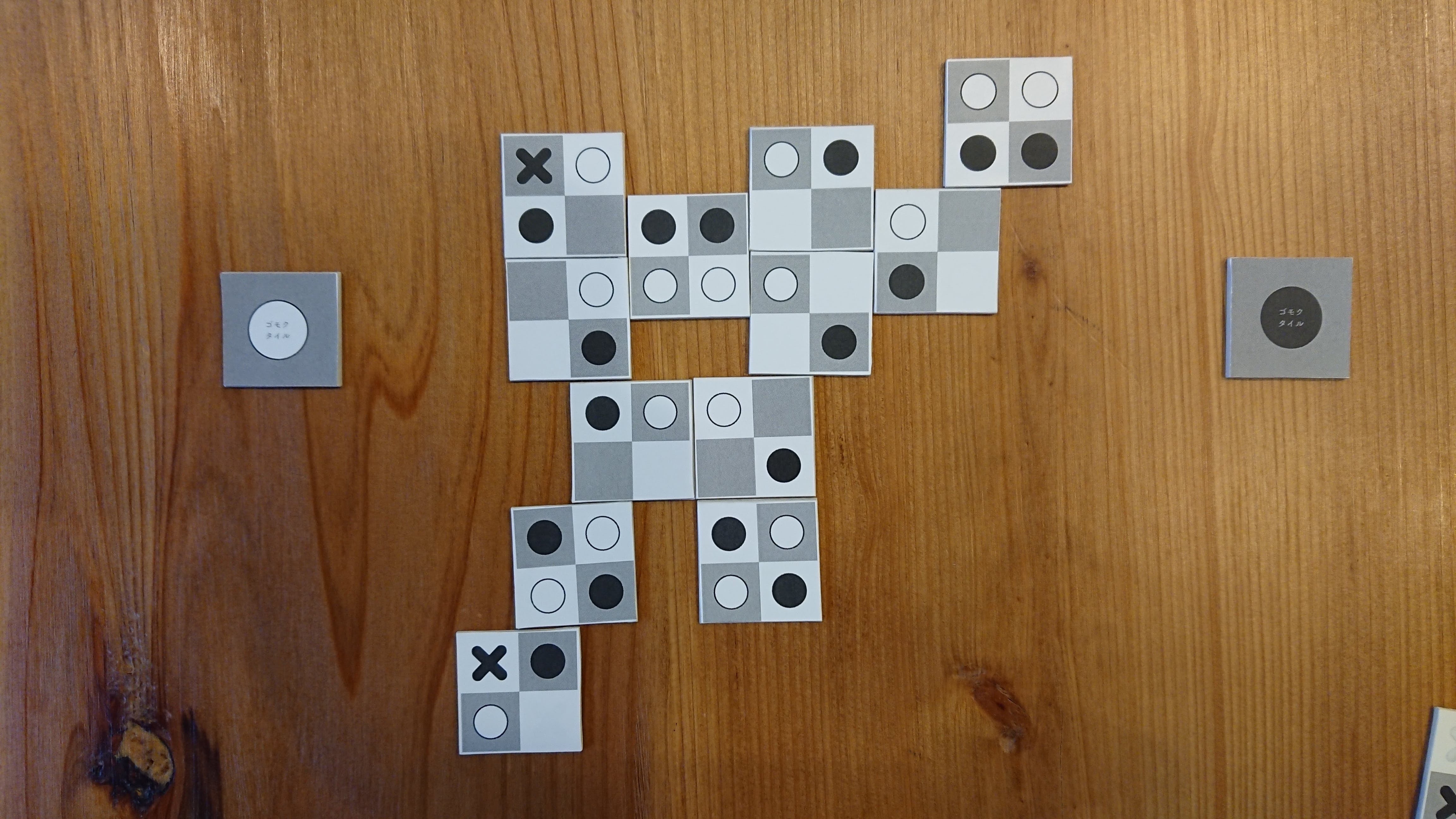 黒石・白石が描かれてあるタイルを配置していき、自身の色の石を5つ以上ならべる五目並べゲームです。石の他には「×」が描かれたマスもあり、そのマスはどちらの石にも含まれないので、両者にとって邪魔なマスになります。