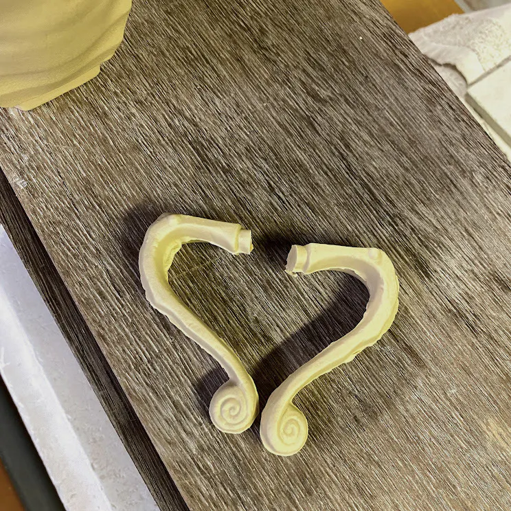 マグカップの取っ手を作り皿板と言う板に無造作に置いた際、偶然にも取っ手がハートの形に。