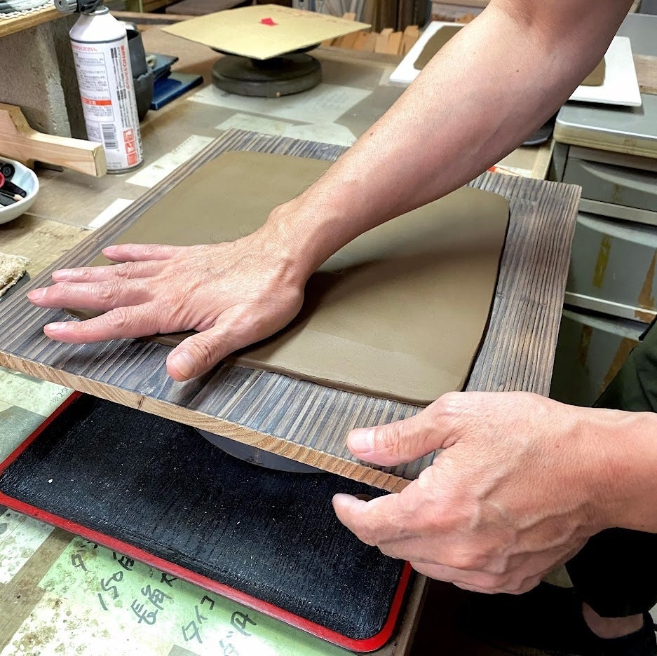 写真の様に実際の杉板に、たたらで製作した陶土の板を杉板の上に乗せて、手の平で叩きながら