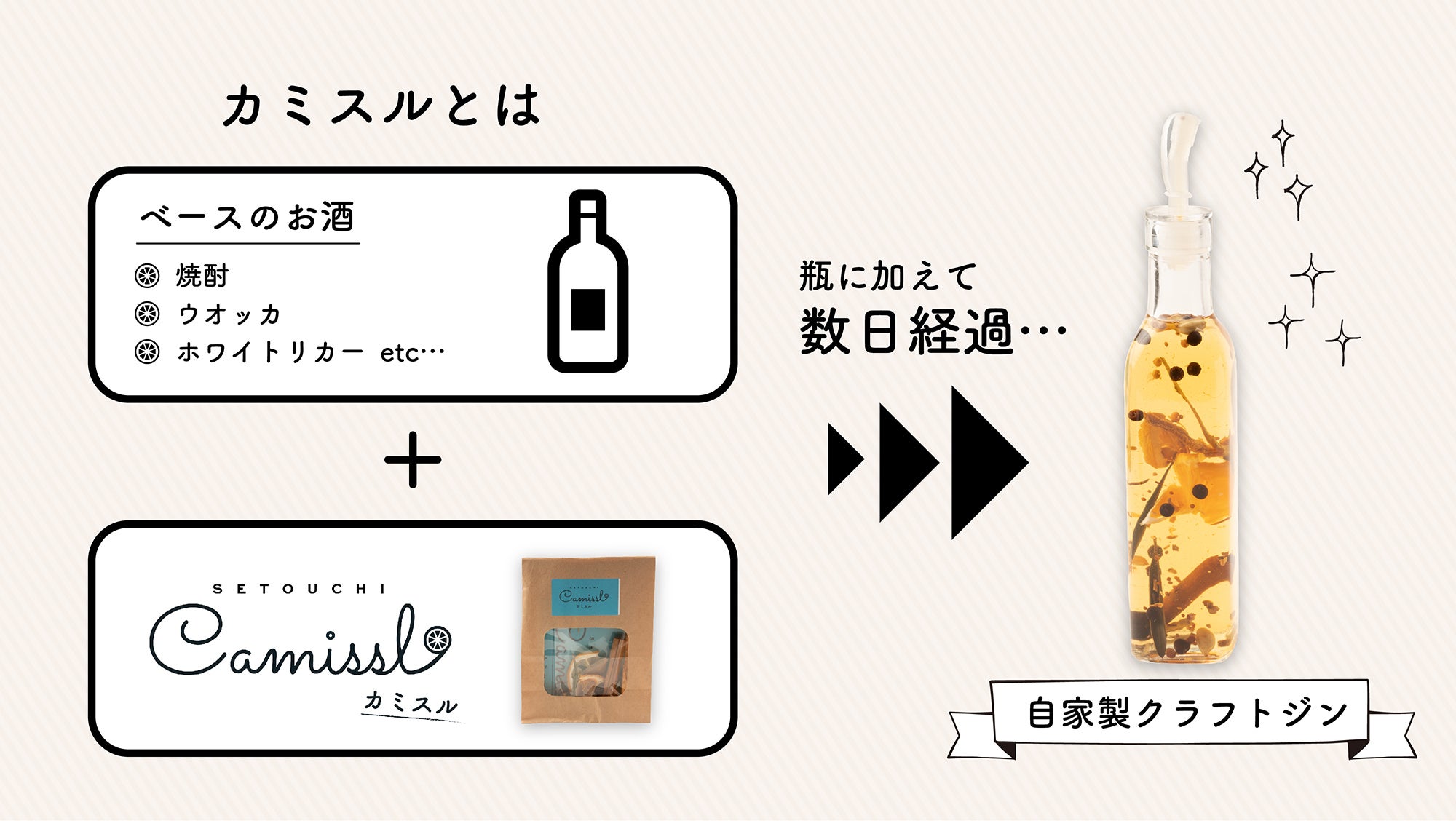 【カミスル】とは何かというと、お家にあるウォッカや焼酎、ホワイトリカーなどにこちらの【カミスル】を入れ数日待つとジンができあがるという見た目めお洒落なジンの素となっています。
