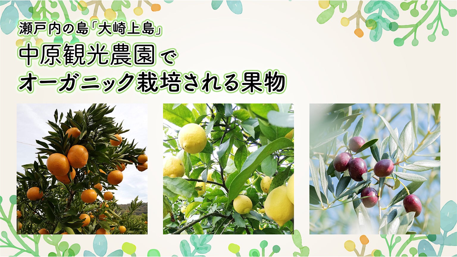 【カミスル】は、瀬戸内海の島、大崎上島より中原観光農園でオーガニック栽培されたレモンとみかんとオリーブの葉っぱを使って作られています。