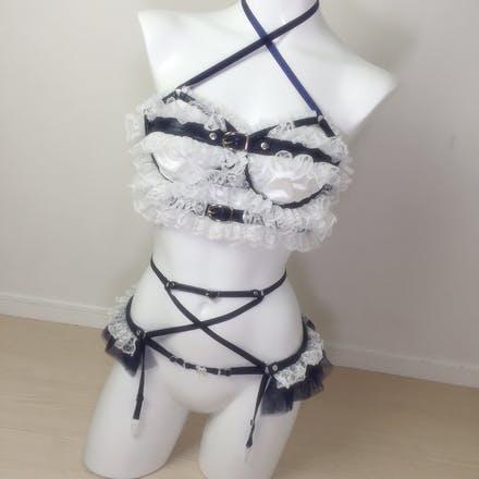 たくさんのレースやチュールで飾られたベルトで身体を拘束された様なデザイン。