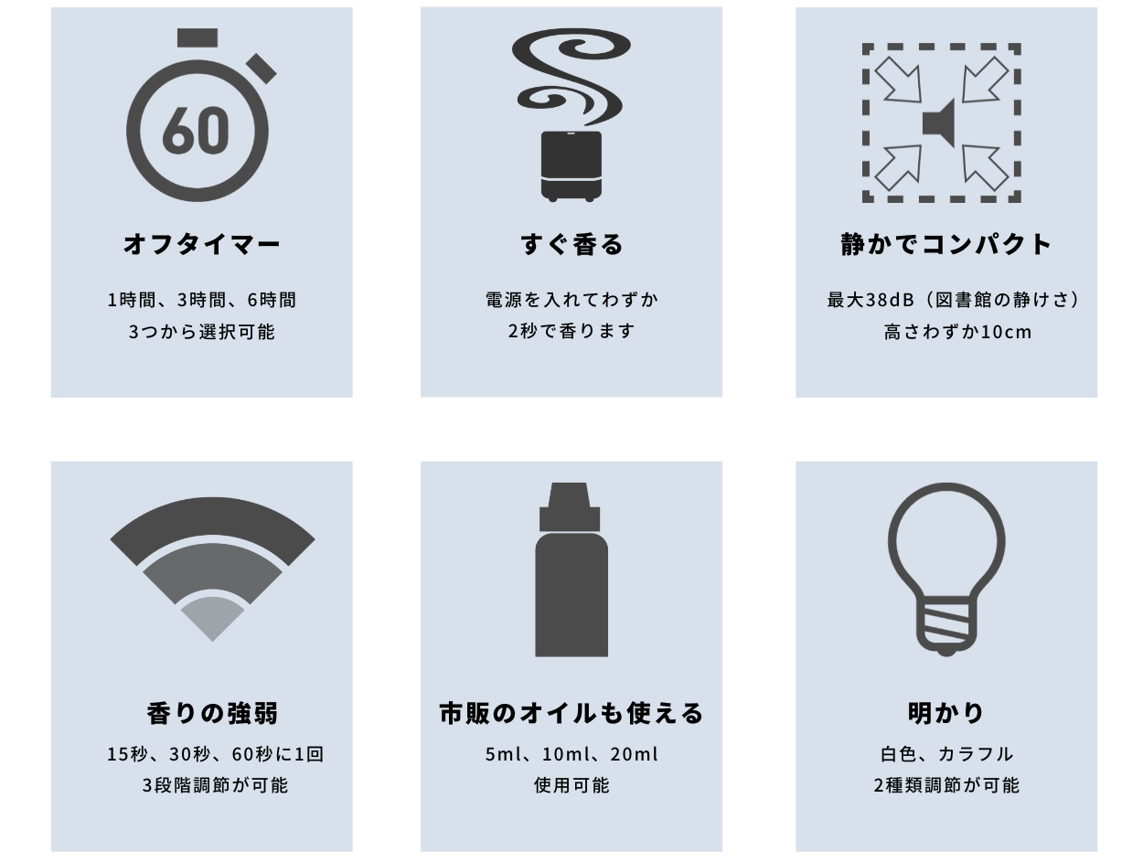 嗅覚は、脳にダイレクトに伝わるため感情を左右する場合があります。おやすみ前の香りを、睡眠前や睡眠中に活用することをおすすめします。