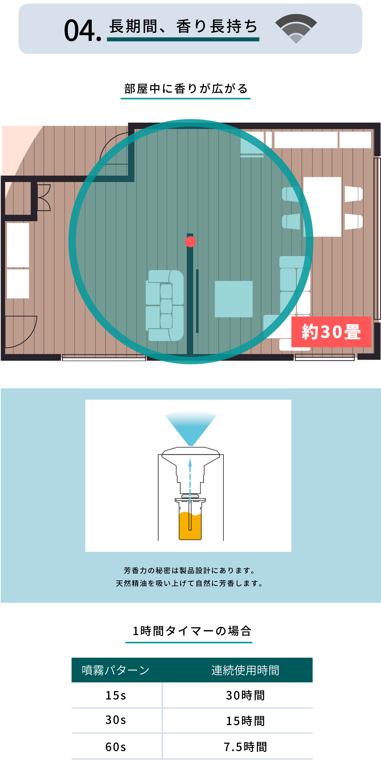 ・香りの持続時間は環境や条件によって異なります。また、香りの感じ方には個人差があります。