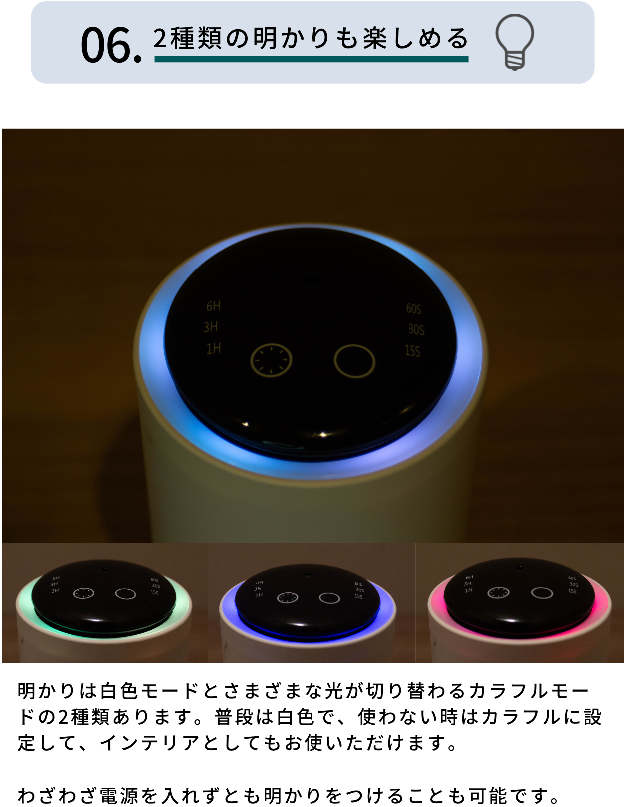 仕様:タイマー付き、ライト2段階(ホワイト・カラフル)