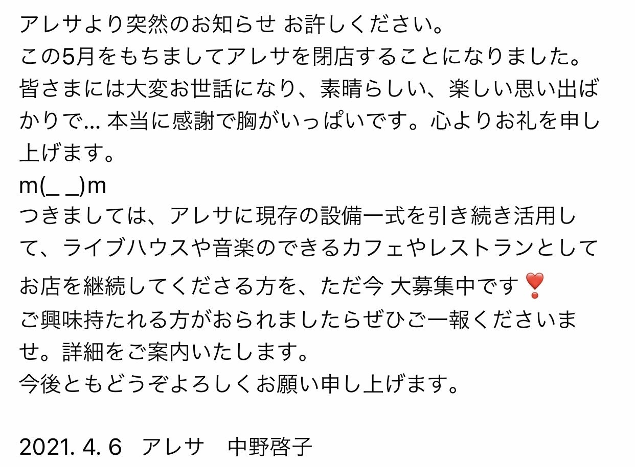 ARETHAのオーナー中野さんより閉店の発表