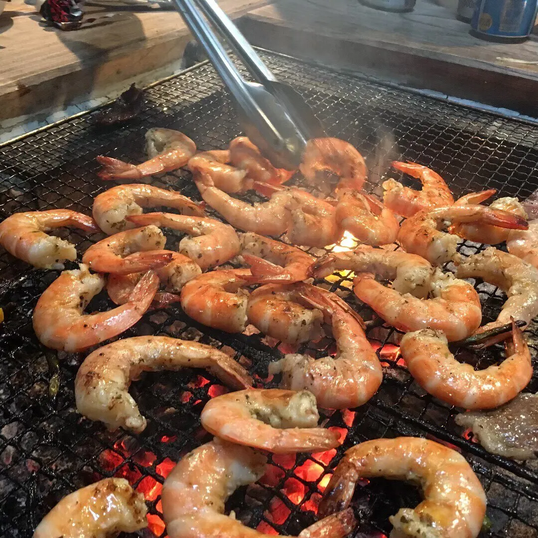白身魚のパン粉焼き、ドレッシング、ムアンバ(ガボンの鶏肉とトマトのピーナッツシチュー)、エビの香草焼き、チキンのバスク煮込み