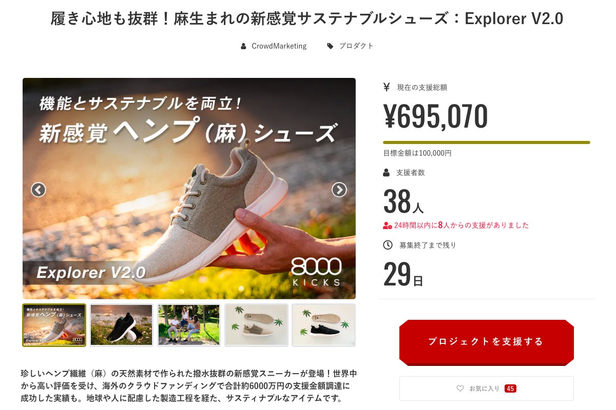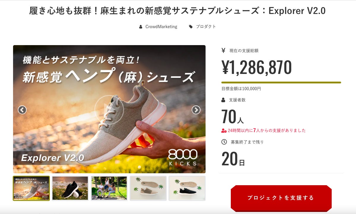 支援者の皆様この度は多くのご支援・応援コメント、誠にありがとうございます。皆様のご支援のおかげで、支援総額2,000,000円を達成致しました!ありがとうございます!!早いもので、残り1日となりました。短い期間ではございますが、一緒に盛り上げていただけると嬉しいです!引き続き、よろしくお願い申し上げます!【8000KICKS 日本公式アカウント】8000KICKS 日本公式アカウントでは、ヘンプシューズの特徴や最新情報、お得なキャンペーン情報など発信しております!!https://www.instagram.com/8000kicks_japan/是非、SNSのフォロー・チェックもお願いいたします!
