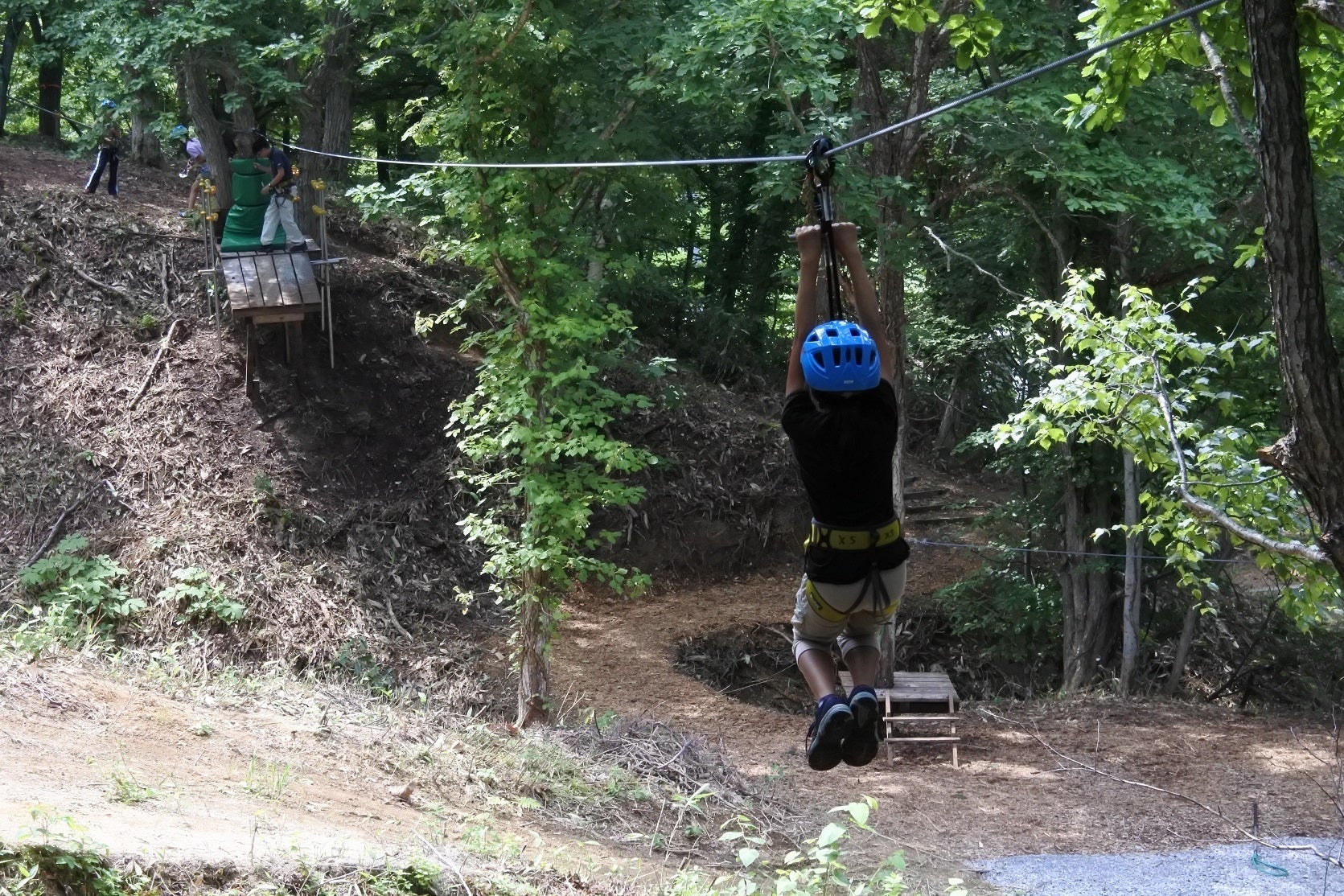*:ジップラインとは、木々の間に張り巡らされたワイヤーに滑車をつけてそれに掴まり滑り降りるアクティビティです。