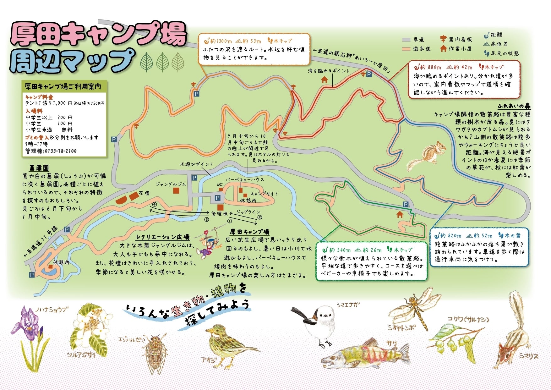 このキャンプ場は、石狩市から委託して運営しているものですが、遊びに来ていただいた皆さんがより楽しめる仕組みを常に考え、運用をしています。例えば、令和元年に設営した、ジップライン*の「アツターザン」は、大自然を気持ちよく滑走してもらうことを目的として、森林コースや川コースなど、全部で3つのコースを用意しました。