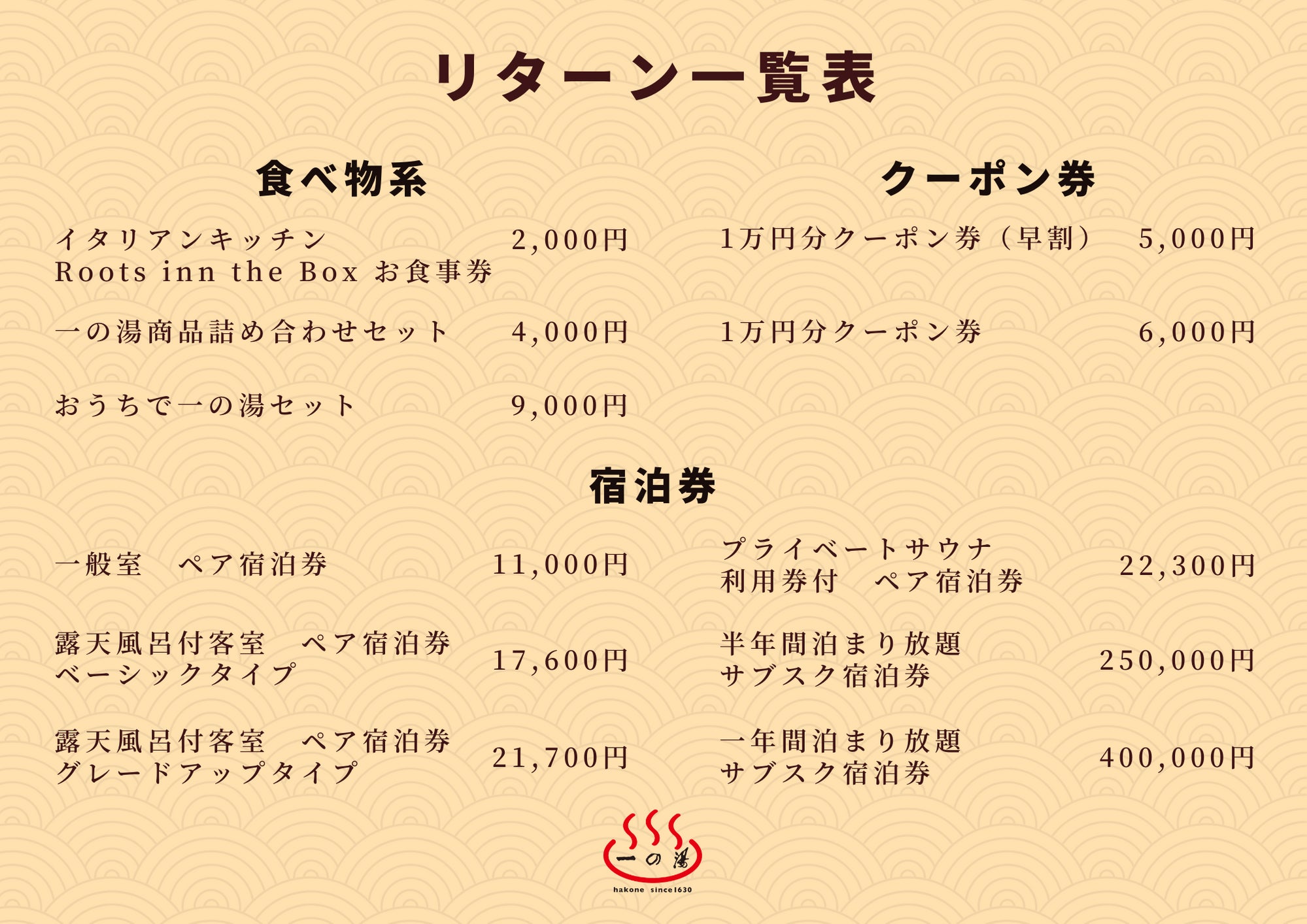 リターンは1万円分のクーポン券を5千円で購入できるチケットや、一の湯のオリジナル商品の詰め合わせセット、そして目玉は1年間泊まり放題のサブスク宿泊券などなど、お得なリターンがいっぱいです!