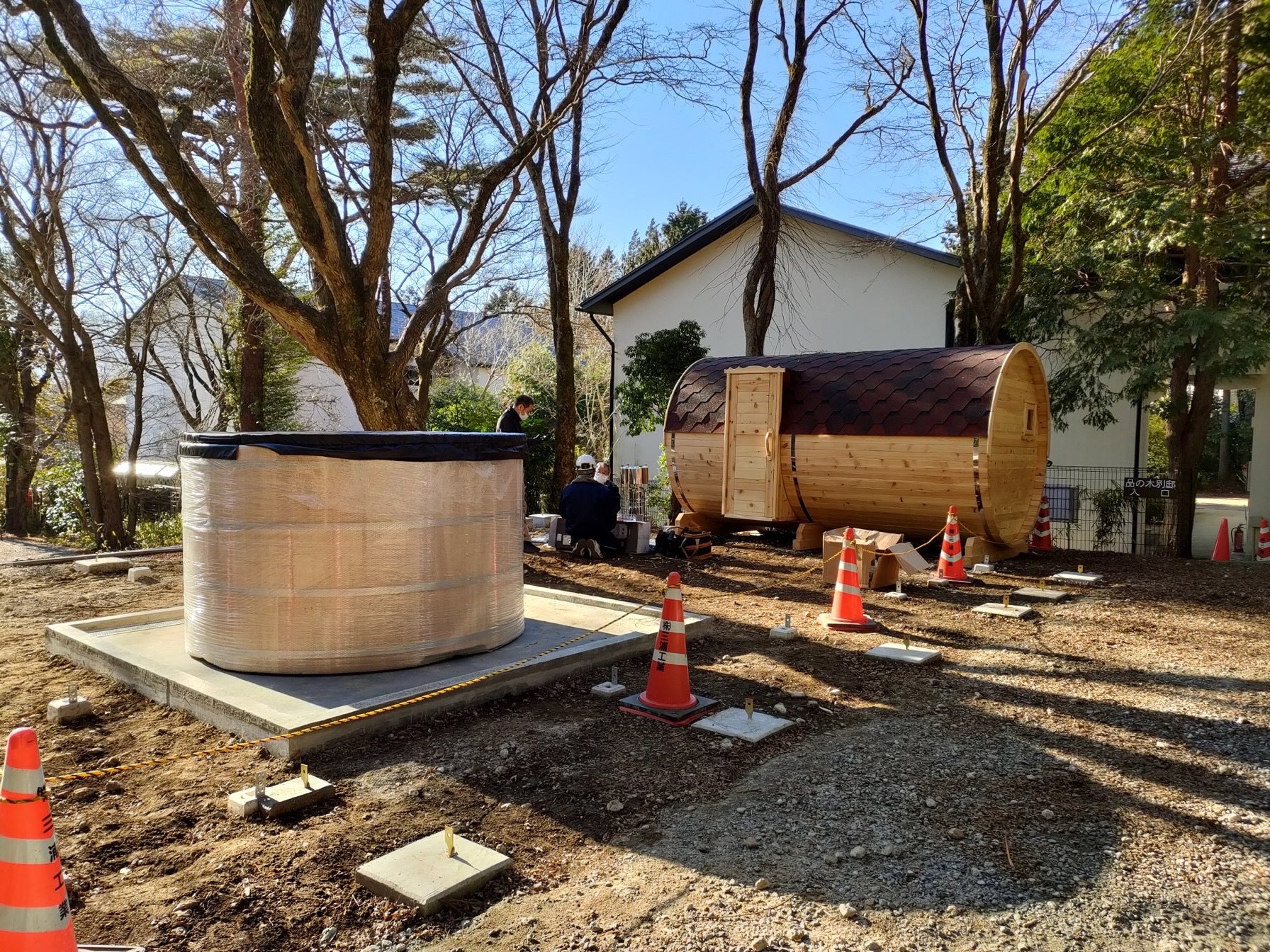 壁面製作前の樽サウナと水風呂です