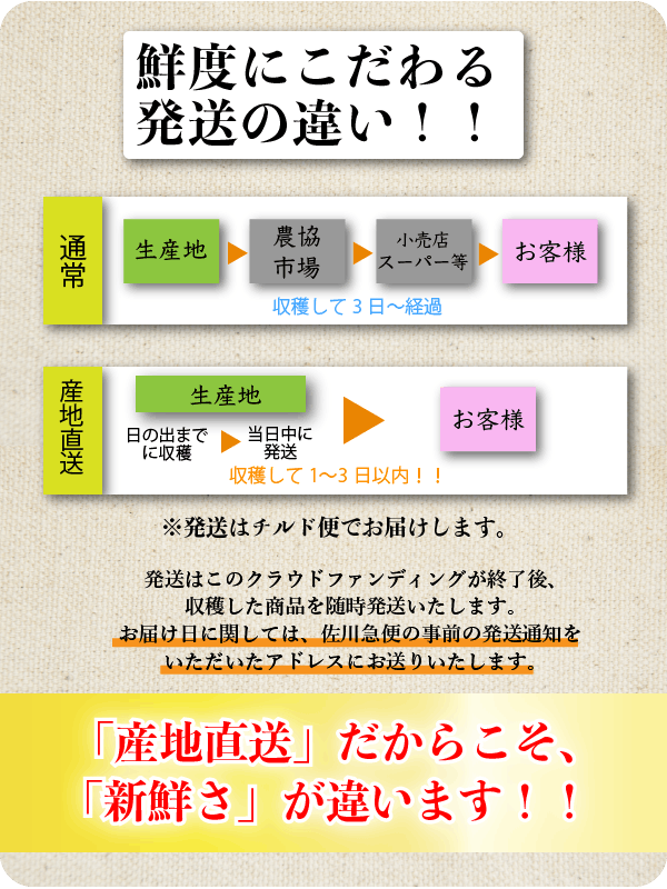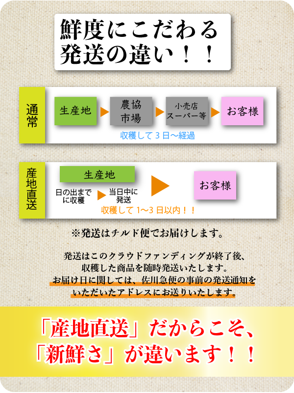 今回の先行予約で国内消費を促すだけでなく、食品ロス、廃棄0を実現するために必要な数を必要な分だけ配送する為にこの先行予約販売を実施しております。