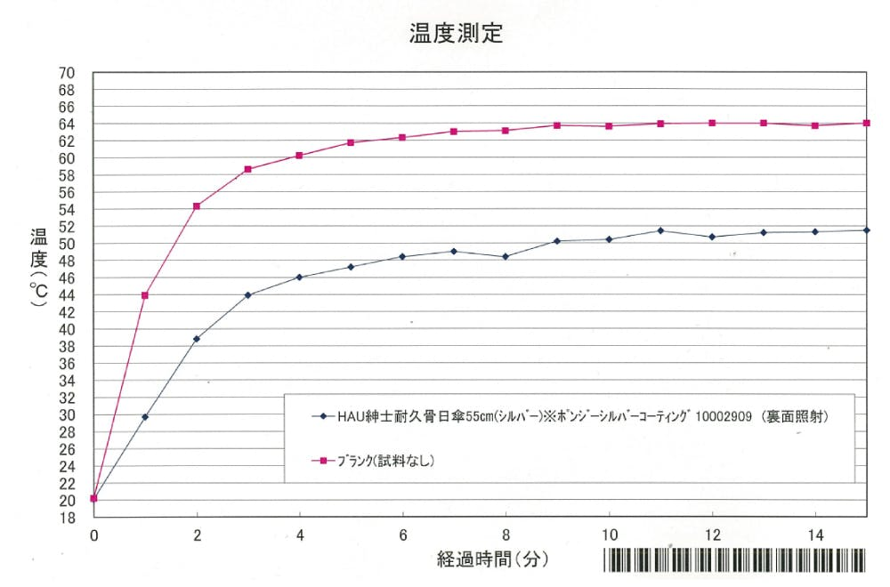 生地無しの場合(ピンク色の曲線)よりも、シルバーコーティング生地(青色の曲線)の方が温度上昇率が低いのがわかります。