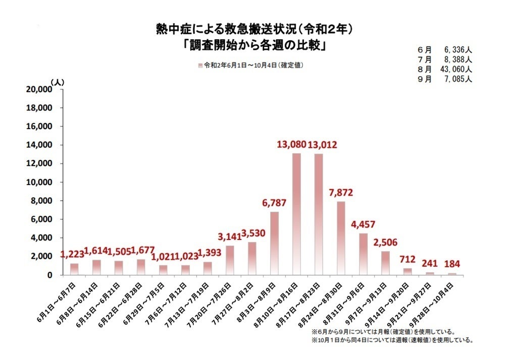 上記のグラフから、昨年は熱中症だけで救急搬送されている人がたくさんいます。コロナ禍において医療がひっ迫状況にあるため、自分自身の身を守る心構えと対策が必要です。医療従事者への負担が減らせるよう、まずは日傘を使用するなど出来ることから始めてみませんか。