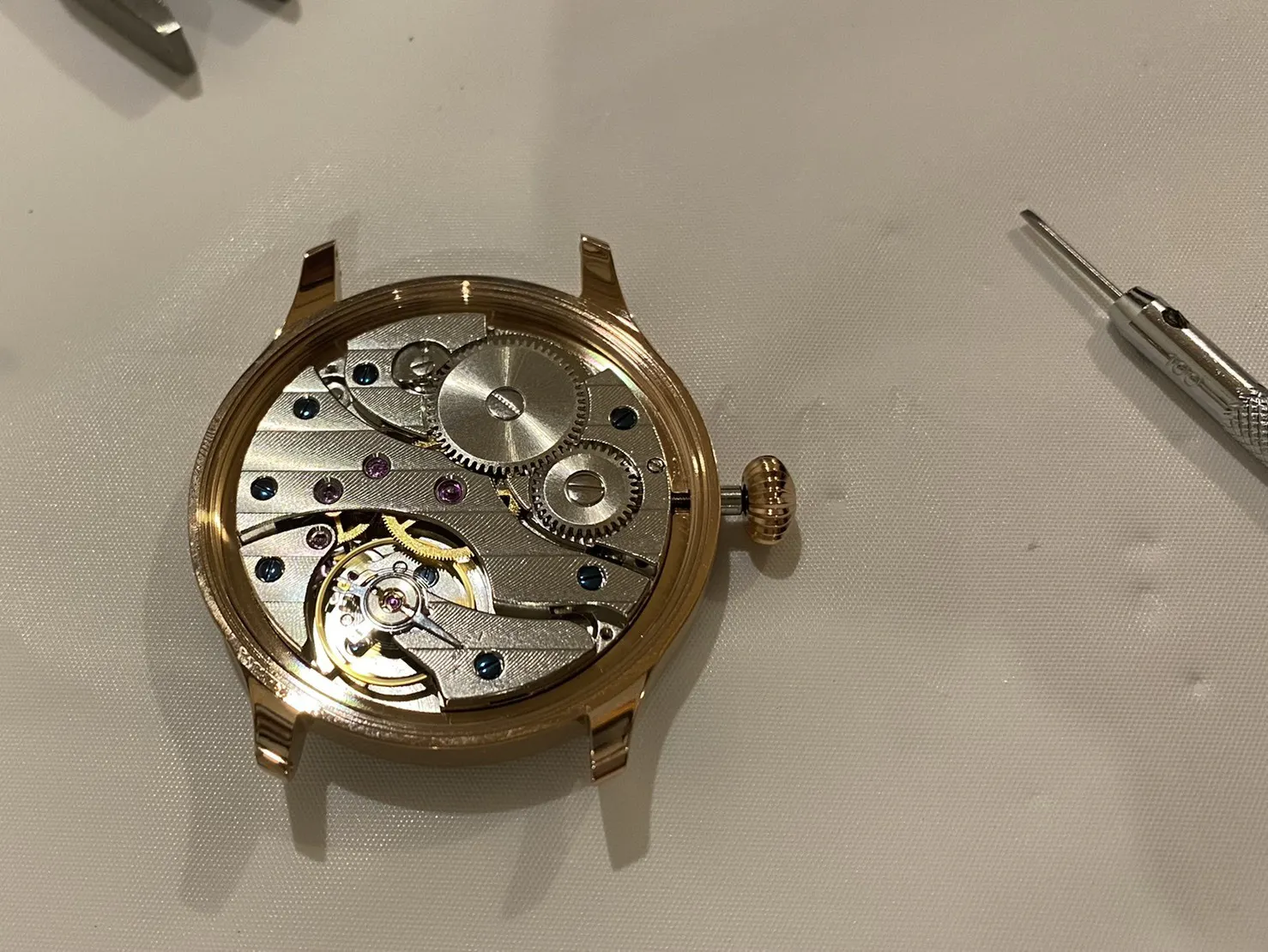 ケースとリューズを取り付け完了したところです。