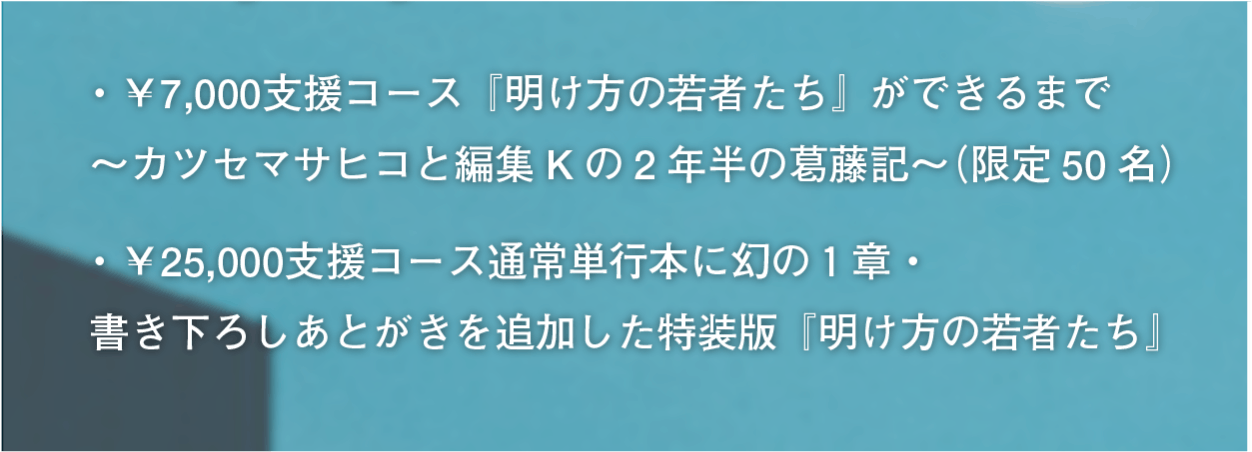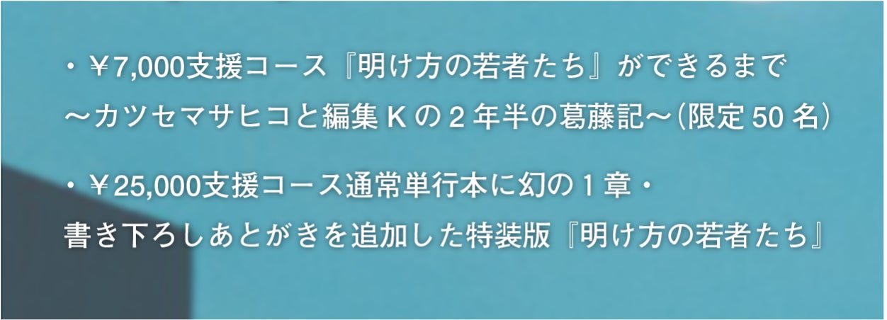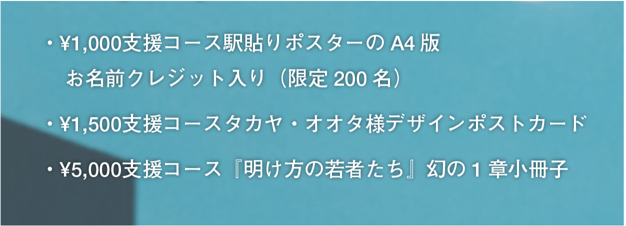 ¥1,350,000達成時に追加する予定だった¥7,000支援コース「明け方の若者たちができるまで」のリターンですが、