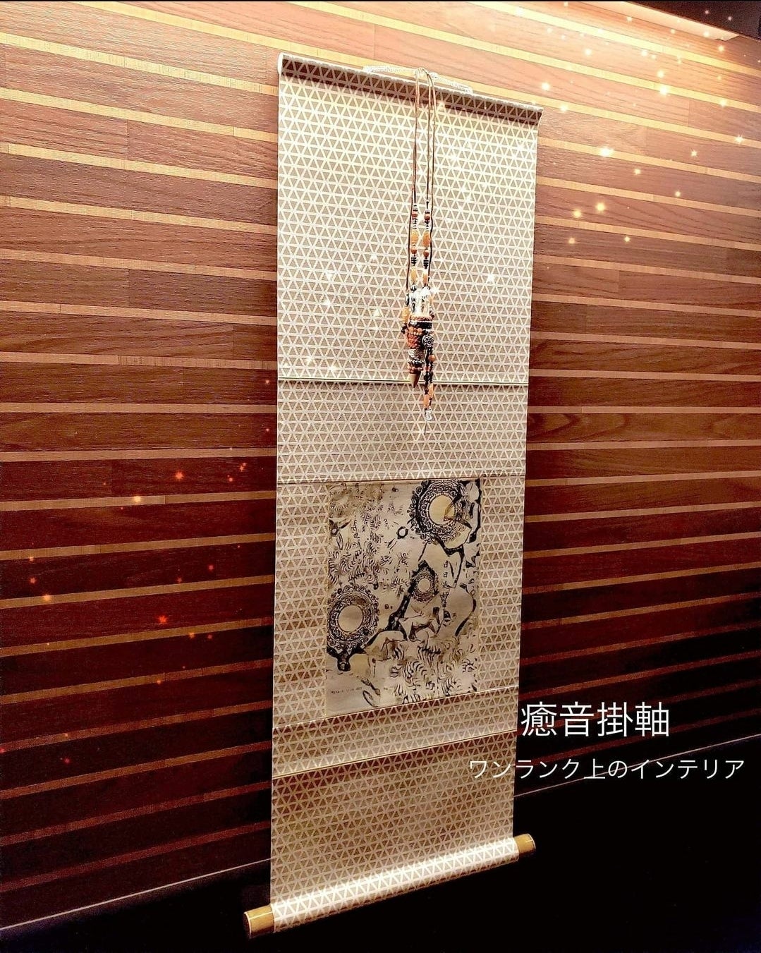 この技術を利用したアート作品『癒音掛け軸』(イオンかけじく)を制作し、室内に癒音京紙を取り入れやすくしました。