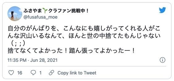改めて、自分ごとのように喜んでくださる姿を見て、嬉しくなっちゃいます。というわけで、そんな気持ちをプロジェクト代表の萌ちゃんのツイートにかえさせていただきます。