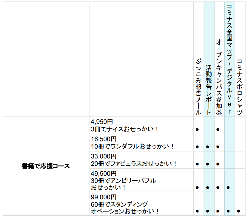 ご支援いただく皆様にさまざまな形でぶっこみプロジェクトに関わっていただけるよう、複数種類の支援方法・リターンをご用意しております。
