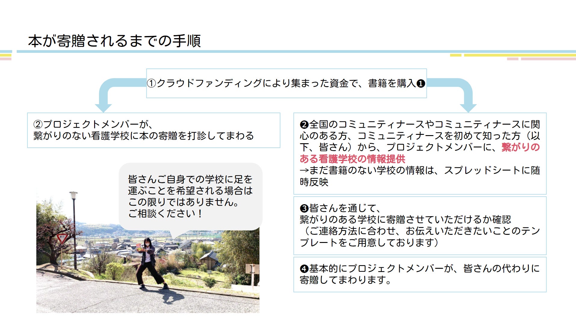 本を寄贈した方(オーナー)からのメッセージやコミュニティナースの情報を掲載し、本を読んだ感想を書く欄が用意された「感想カード」を添え、全国の看護学校への設置を打診します。また、書籍の設置のみでは読んでもらうことが難しいと考えており、全国各地のコミュ二ティナースと学生を繋ぐイベントをオンラインで開催していきます。