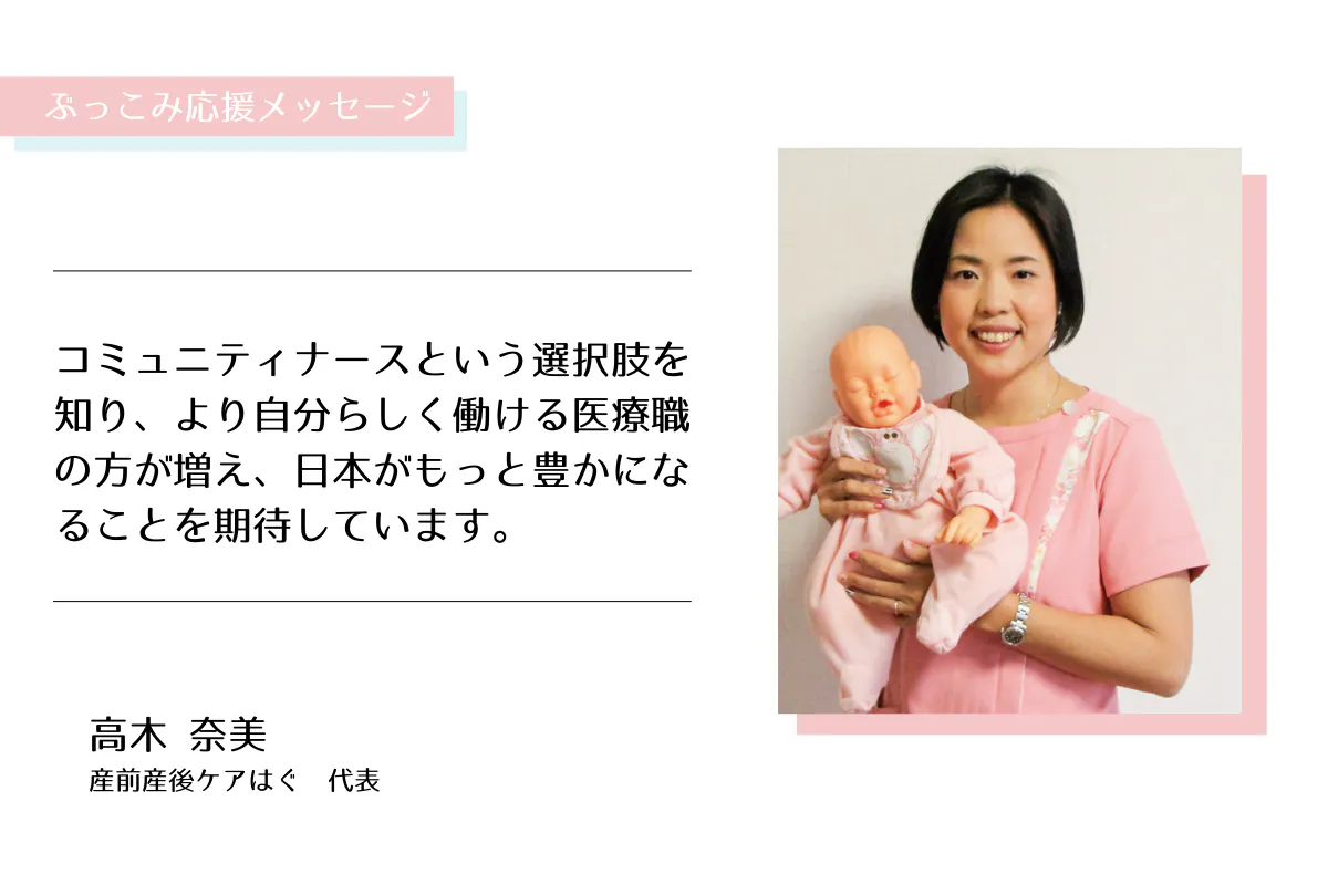 ぶっこみプロジェクトを通して、コミュニティーナースという選択肢も知り、より自分らしく働ける医療職の方が増え、日本がもっと豊かになることを期待しています。ぶっこみプロジェクトを全力おせっかい応援しています!!!!!