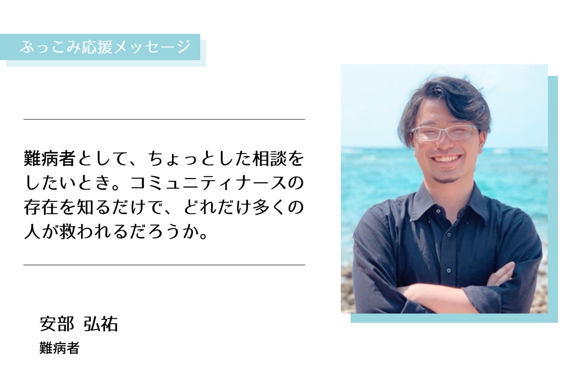 どうも、あべこうです。私は大学進学直前に難病ネフローゼ症候群を発症し、今もなお大学生活を送りながら闘病中の身です。私はよく、主治医に電話するほどではないけど、不安になることがあります。食べ物や薬の飲み忘れなどですね。その不安が来たとき、コミュニティナースの存在を知っていればどれほど心強いか!とよく思います。