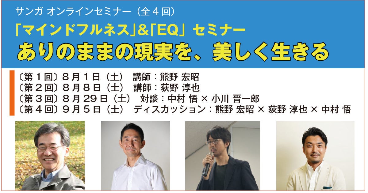 近年はオンラインセミナーにも力を入れていました。例えば、2020年8月には〔ウィズコロナ時代のメタスキルを育てる「マインドフルネス」&「EQ」セミナー〕を開催し、マインドフルネスの研究者・熊野宏昭先生をはじめとする講師の方々から、充実の講義をいただきました。