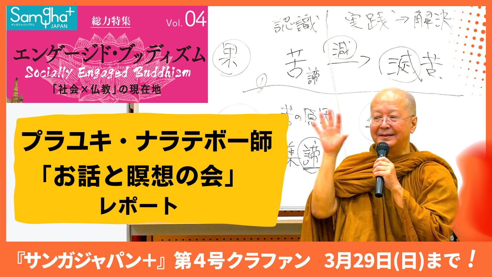 <クラウドファンディング>仏教総合誌『サンガジャパン+』第4号を「紙書籍」で刊行します!2026年3月29日(日)23:59まで開催中!↓https://camp-fire.jp/projects/929144/viewクラウドファンディングで復刊した書籍を、スマナサーラ長老と読む2026年5月末に刊行予定の仏教総合誌『サンガジャパン+』第4号は、本日「3月29日(日)23:59」までクラウドファンディングで事前予約を受け付けています。いよいよ最後の数時間となりました。本誌掲載記事としてクラウドファンディング最終日にご紹介するのは、「アルボムッレ・スマナサーラ長老と『無常の見方』『苦の見方』『無我の見方』を読む」です。この記事は、スマナサーラ長老のご著書『無常の見方』『苦の見方』『無我の見方』の刊行を記念して開催したオンラインセミナーを、あらためて編集したものです。「無常・苦・無我」は、仏教の最重要語です。スマナサーラ長老はこの講義で、「無常とは存在そのもの」であり、あらゆるものは変化し続けることで成り立っているのだと語られました。さらに、無常と苦と無我は別々の教えではなく、存在の本当の姿を示すつながった見方であることを、宇宙や音、身体の変化など、さまざまな具体例を通して解き明かしてくださいました。クラウドファンディングという善行為この『無常の見方』『苦の見方』『無我の見方』の3冊も、2023年に実施したサンガ新社のクラウドファンディングによって刊行できた書籍です。講義の終わりに、スマナサーラ長老は次のように語ってくださいました。クラウドファンディングにご協力くださった340名の方々は、最高の善行為に参加しました。損得しか頭にないこの世の中で、ブッダの言葉を出版することは大変難しいことです。そういうわけで皆様の協力が偉大なる善行為であることは確かです。皆様本当にありがとうございました。オンライン講義でお話しされるスマナサーラ長老このお言葉をうかがって、私はあらためて、出版を通して仏教の智慧を社会に届けていくことの意味を深く感じました。皆さんのご支援の素晴らしさを実感するとともに、その想いをしっかり受け取り、出版活動に取り組む責任に背筋が伸びる思いがしました。『無常の見方』『苦の見方』『無我の見方』は、2023年11月にサンガ新社から復刊し、その後増刷することもできた大切な書籍です。その内容をスマナサーラ長老ご自身の語りで読み深められるこの記事を、ぜひ『サンガジャパン+』第4号でお読みください。最後のお申込みをどうぞよろしくお願いいたします『サンガジャパン+』第4号のクラウドファンディングは、いよいよ本日締切です。ここまでの皆さんの温かいご支援に、心より感謝申し上げます。3月29日(日)18時30分時点で、ご支援総額は146万7800円となっています。目標150万円まで、あと4万円です。ここまで積み重ねていただいた皆さんの想いを、なんとしても目標達成というかたちにつなげたいと思っています。そしてこの一冊を、少しでも多くの方へ、しっかりと届けたいです。締切は「2026年3月29日(日)23:59」です。最後の最後まで、どうかお力添えをよろしくお願いいたします。<クラウドファンディング>仏教総合誌『サンガジャパン+』第4号を「紙書籍」で刊行します!2026年3月29日(日)23:59まで開催中!↓https://camp-fire.jp/projects/929144/view