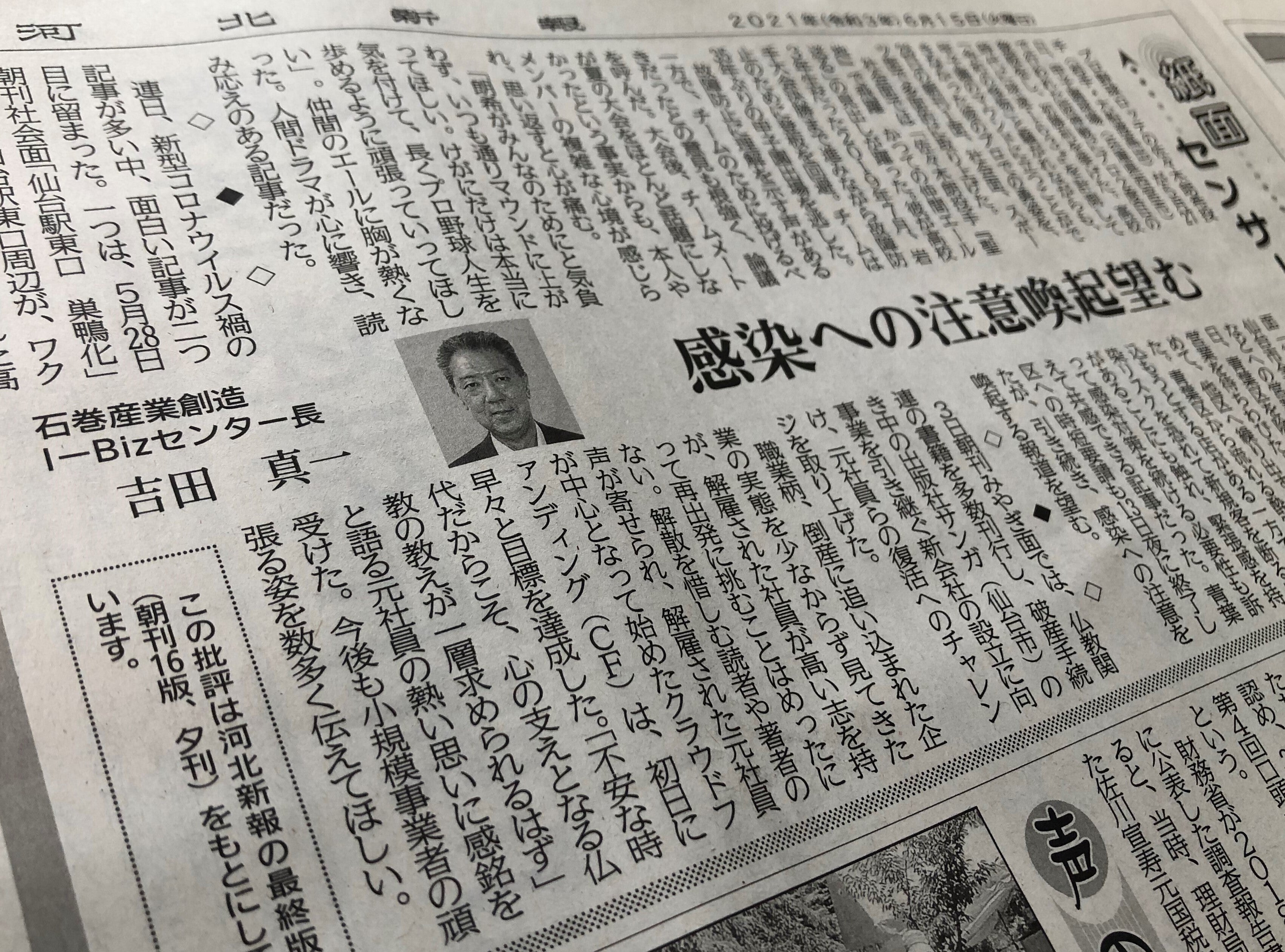 さて先日お伝えした通り、2021年6月3日『河北新報』朝刊に「「サンガ」再出発へ」という記事で、このクラウドファンディングの取り組みを紹介していただきました。