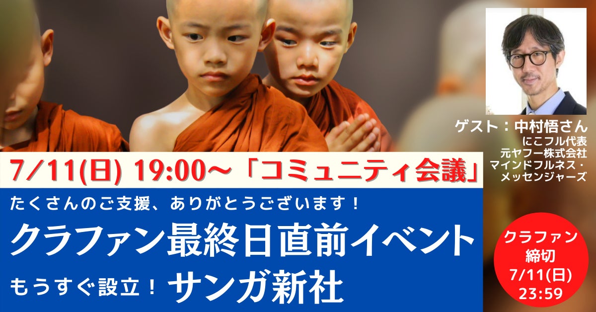 サンガ新社では読者のみなさんとの交流を大切にしていきます。そして、そこから生まれる「コミュニティ」はどんな可能性をもっているのでしょうか。最終日には、にこフル代表/元ヤフー株式会社マインドフルネス・メッセンジャーズの中村悟さんをゲストにお招きし、魅力あるコミュニティについて一緒に語り合いながら、ご参加いただくみなさんともお話ししていきたいと思います。