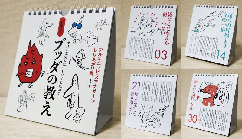 『日めくりブッダの教え』は、2016年にサンガより発売された31日分の日めくりカレンダーです。スマナサーラ長老の言葉に合わせて、しりあがり寿先生にユニークなイラストを描いていただいた人気商品なのですが、現在は入手困難になってしまい、サンガ新社にも限られた数しか残っておりません。