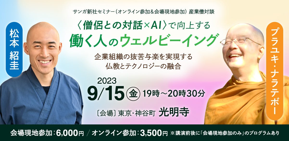 職場にいる僧侶を「産業僧」と言います。サンガ新社では、この産業僧の活躍に注目し、実際に産業僧として活動している松本紹圭師とプラユキ・ナラテボー師をお招きし、ご対談をいただきます。