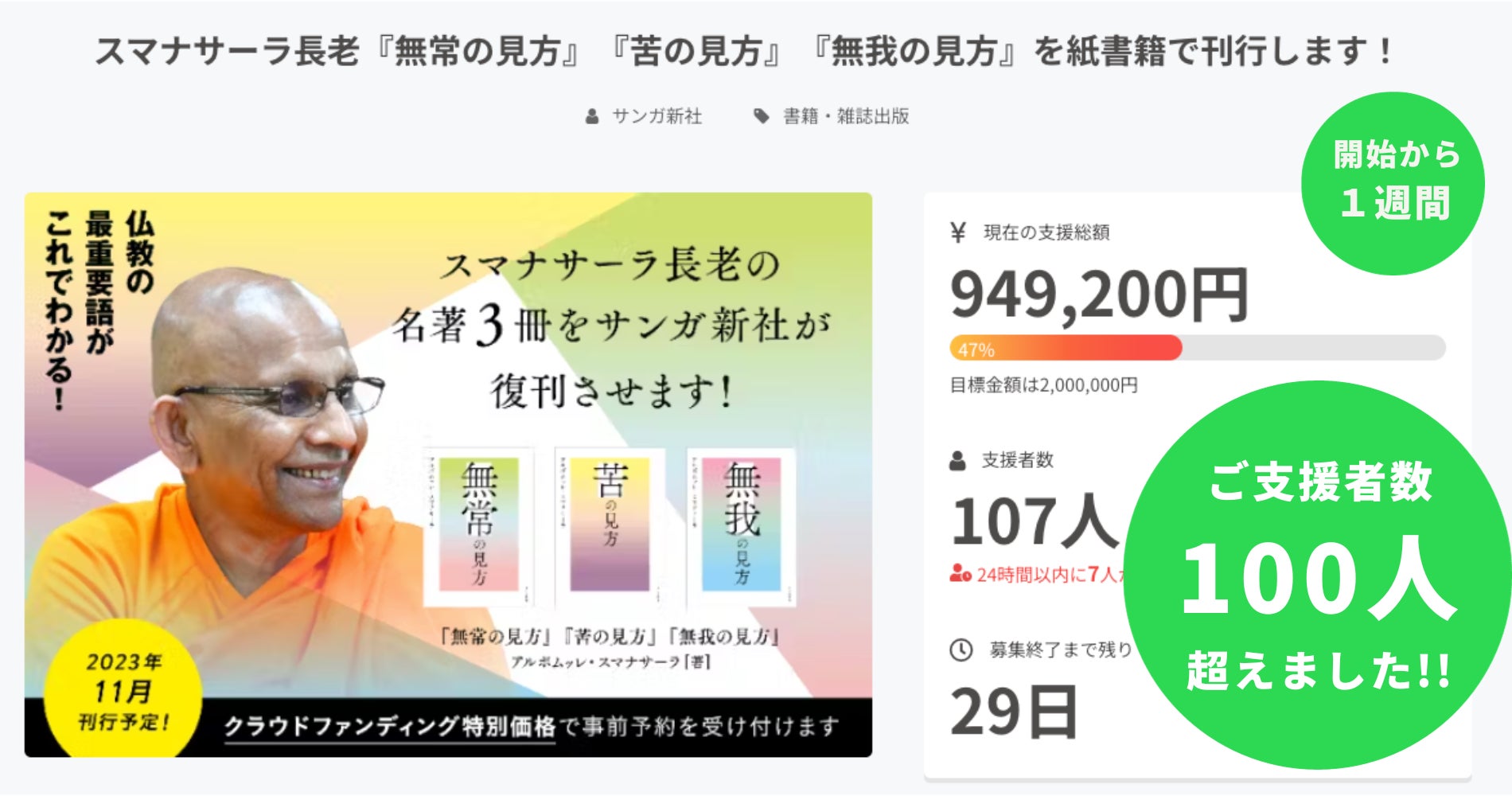 先週スタートした「スマナサーラ長老『無常の見方』『苦の見方』『無我の見方』を紙書籍で刊行します!」クラウドファンディングは、開始から1週間となりました。