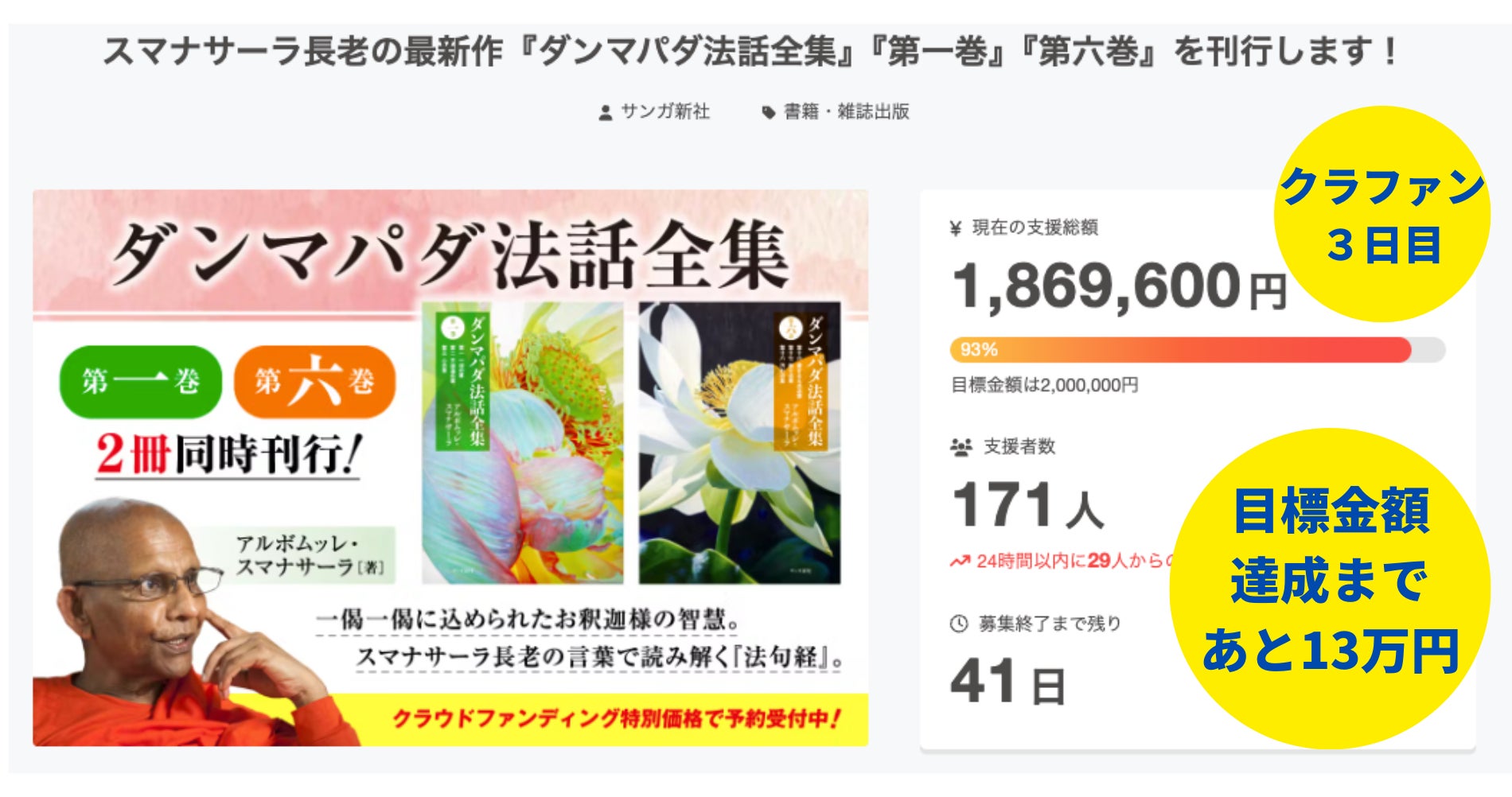 2025年5月17日(土)にスタートした『ダンマパダ法話全集 第一巻・第六巻』のクラウドファンディングは、本日5月19日(月)20時30分現在、支援総額186万9600円となり、目標金額200万円まで、あと13万400円となりました。