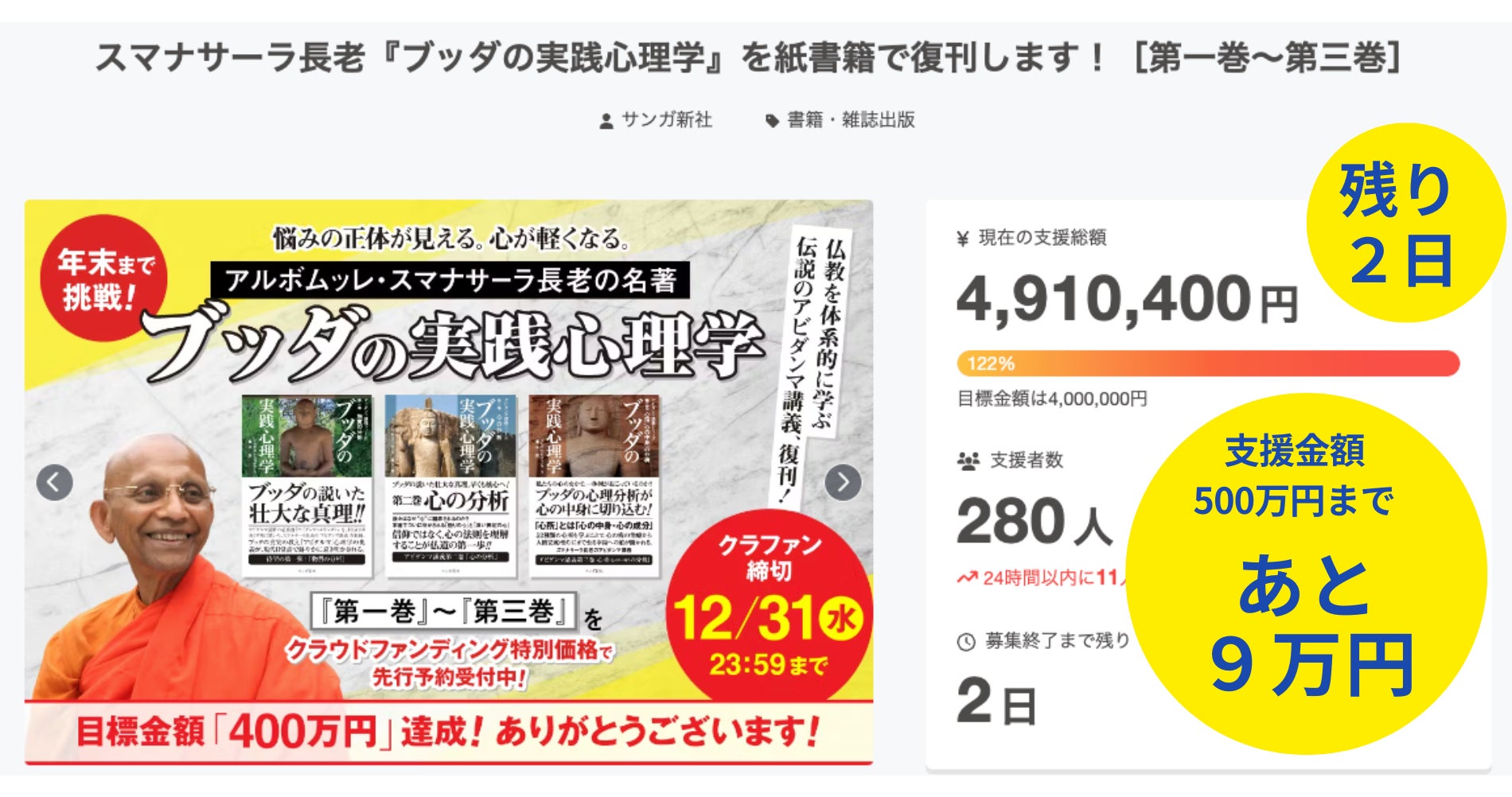 『ブッダの実践心理学』復刊クラウドファンディングは、12月29日15時時点で、支援総額は4,910,400円、280名の方からご支援をいただいています。