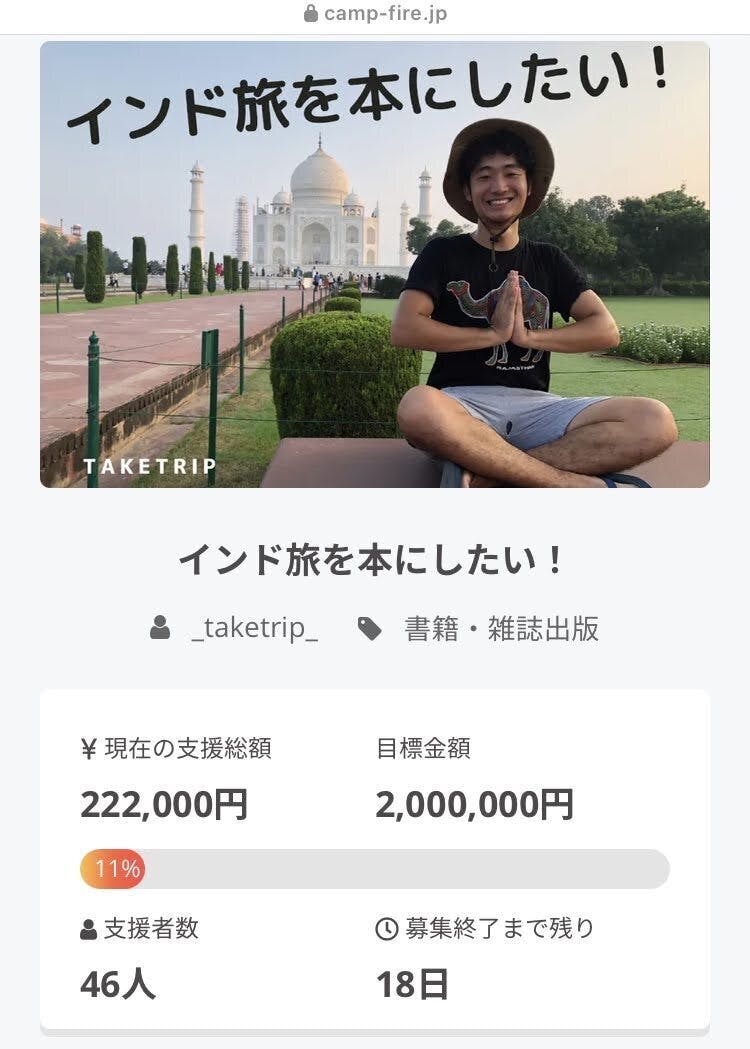 2021/05/17 19:07こんにちわ!たけとです。記念すべき1回目の活動報告をしたいと思います。本当にありがたいことに現在の支援者46人の方に支援していただき、支援総額222,000円で目標金額の約11%です。(2021年5月17日18:00現在)中にはSNSで情報を拡散してくれた方、メッセージをくれた方、友人に広めてくれた方など、支援してくださった方々のおかげでここまでくることができました。本当にありがとうございます!ここからは、僕の今の本音を書きたいと思います。正直に言うと、もっと最初の1週間で伸びると思っていました。目標が200万円ということもあって、1週間で目標金額の40%(80万円)を集めることが目標でした。ですが、1/4という厳しい現実を突きつけられました。僕の人脈をフル活用して、LINEのグループや個人LINEにお知らせしたり、インスタやFacebookなどのSNSの投稿をしたり、イベントの開催など、僕にできることはほぼ全てやった気がします。今はクラウドファンディングの難しさと同時に、マーケティング、ブランディングの難しさを感じています。・どうやったら、みんなを巻き込めるんだろう。・なぜ、友達は支援してくれないんだろう。・支援したくなるようなリターンがないのだろうか。・どういう広報の仕方がいいんだろう。これらにほぼ毎日悩まされています。最近は暇になるとクラファンのことを考えています。元から成功率の低いことにチャレンジしているので、覚悟はしていましたが、いざ自分がこの状況に置かれるとすごく考えさせられます。「どうやったら成功するのか、、、」ということにフォーカスしようと意識していますが、最近はどうしても、「失敗したら、、、」というネガティヴな方に流れがちです。でも、これまで支援してくれた方々のためにも僕のチャレンジで勇気をもらっている人たちのためにも残り18日全力で頑張りたいと思います!! もっと見る