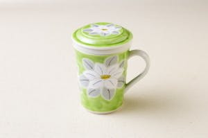 九谷焼茶漉し付きマグカップ「三件杯」(サンジェンペイ)。「三件杯」とは、マグカップ本体、蓋、茶漉しの3点で構成されることからこの名前が付けられています。