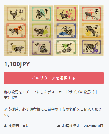 1万円・2万円・5万円の共通のリターンとして「飾りをモチーフにしたポストカードサイズの絵馬(十二支) 各1枚(合計12枚)」 をお届けいたします。