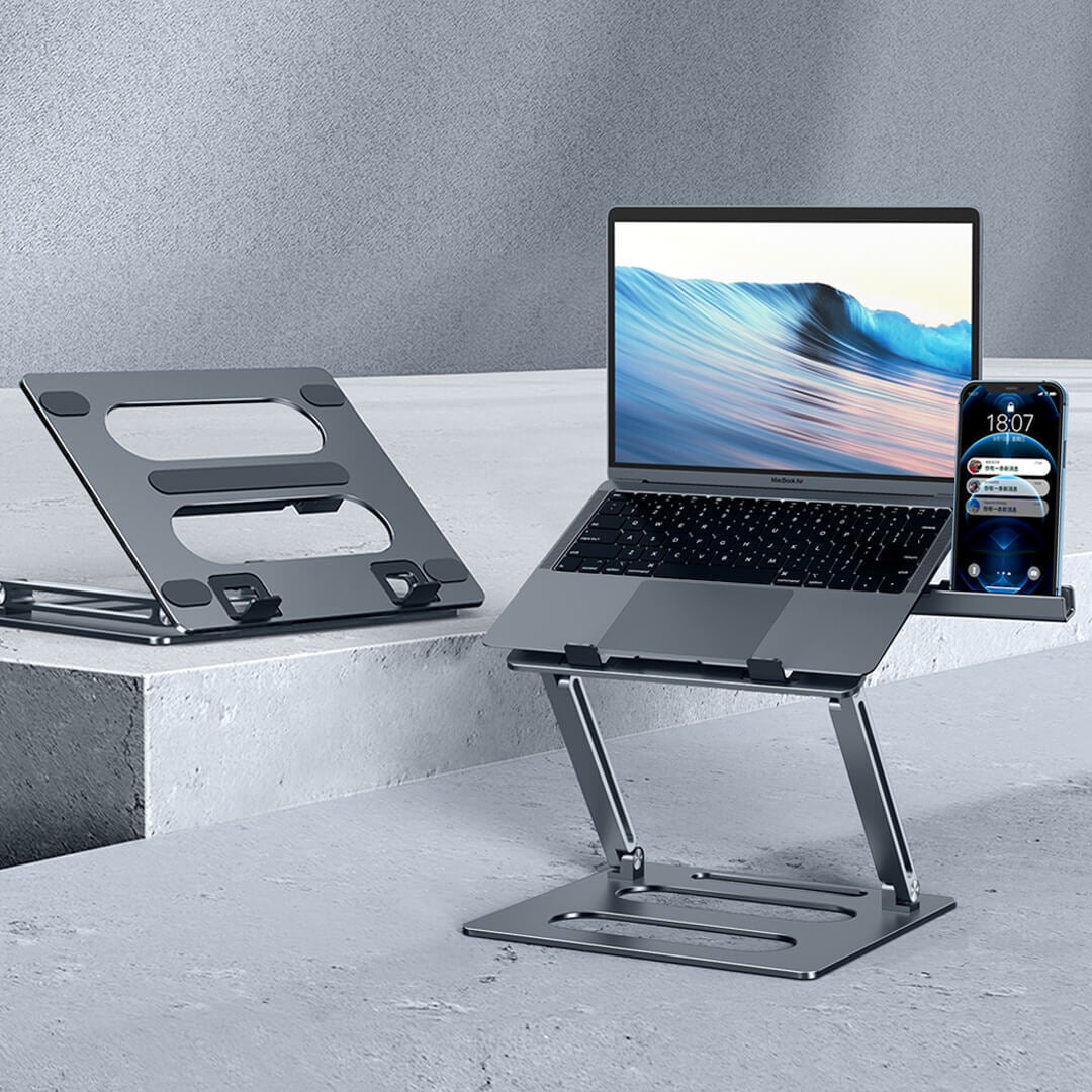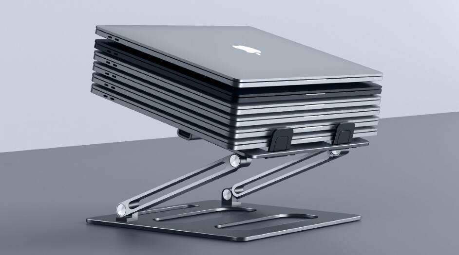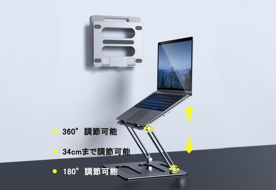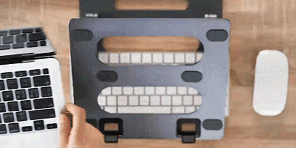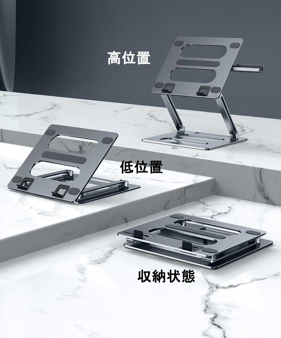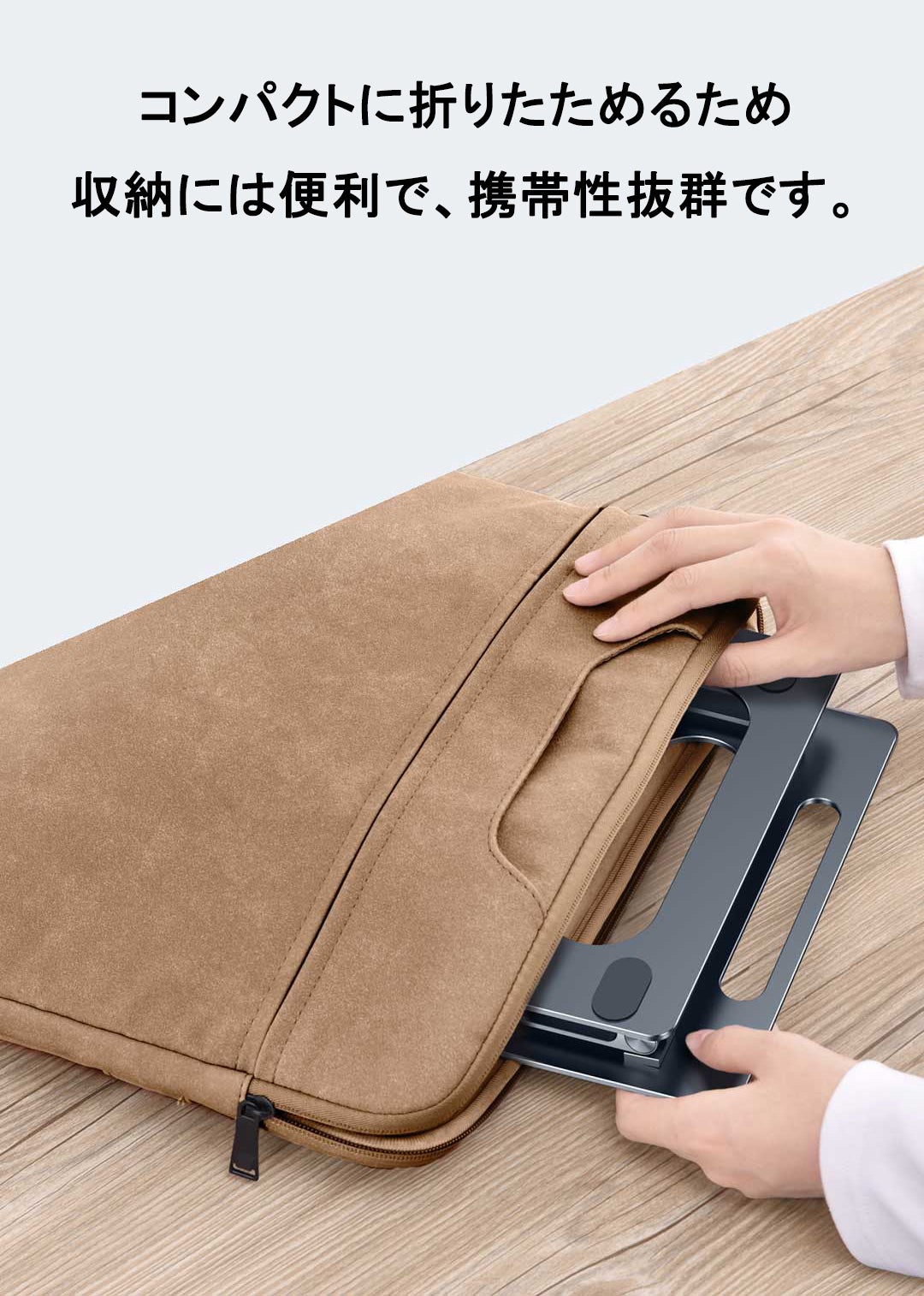 ノートPCスタンドは折り畳み式を採用し、使わない時は簡単でコンパクトに収納できます。本棚、家具の隙間など空きスペースに収納できて省スペース!折りたたみ仕様で、家、オフィス、喫茶店...いつでもどこでも使用可能でとても便利です!本体の重さは900g、折りたたみ後の寸法は260mm*248mm*35mm、携帯便利性もがります。