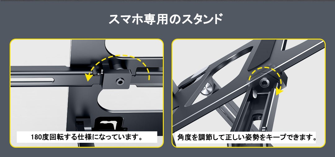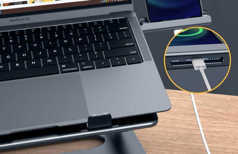 パソコンでの作業中に首を下げてスマートフォンの画面を表示する他のスマートフォンスタンドとは異なり、サイドにスマホホルダーが内蔵し、穴を開いたため、充電しながらスマホを楽しめる、デュアルディスプレイを実現!パソコン作業を中断することなく通知などがそのままチェックし、この巧妙な設計により、シームレスなマルチタスクが可能になり、作業効率が上がります。