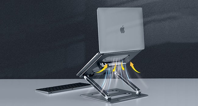 風通しを作ってあげることでパソコンの熱を逃がす効果も!ノートPCを直接テーブルに置き、長時間作業をするとPCが熱暴走をしてしまう可能性があります。このスタンドは熱伝導率の高いアルミ素材で制作されており、中空設計なので、PC裏面の放熱面積が増え、ノートパソコンの底面の通気性が向上します。