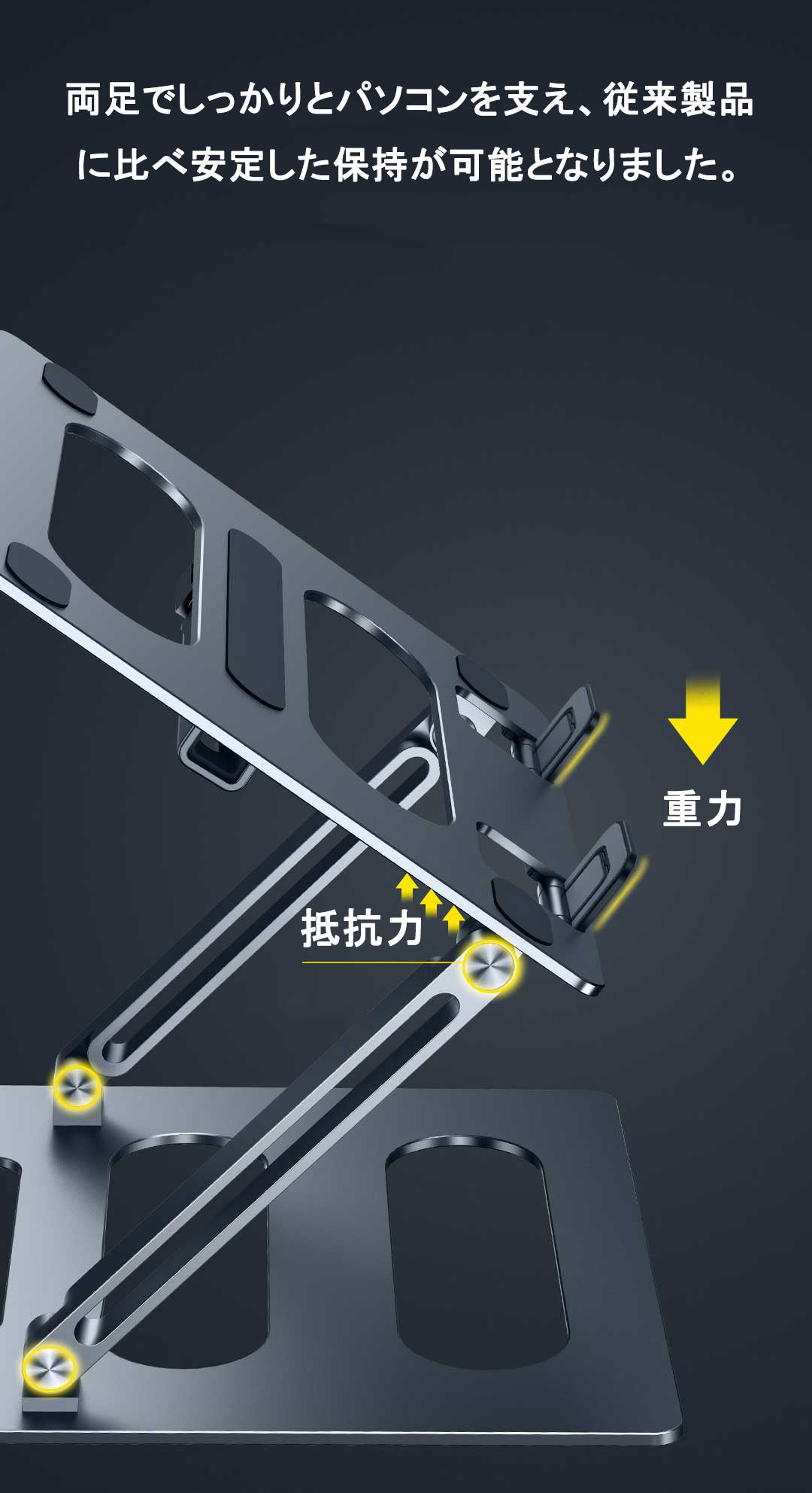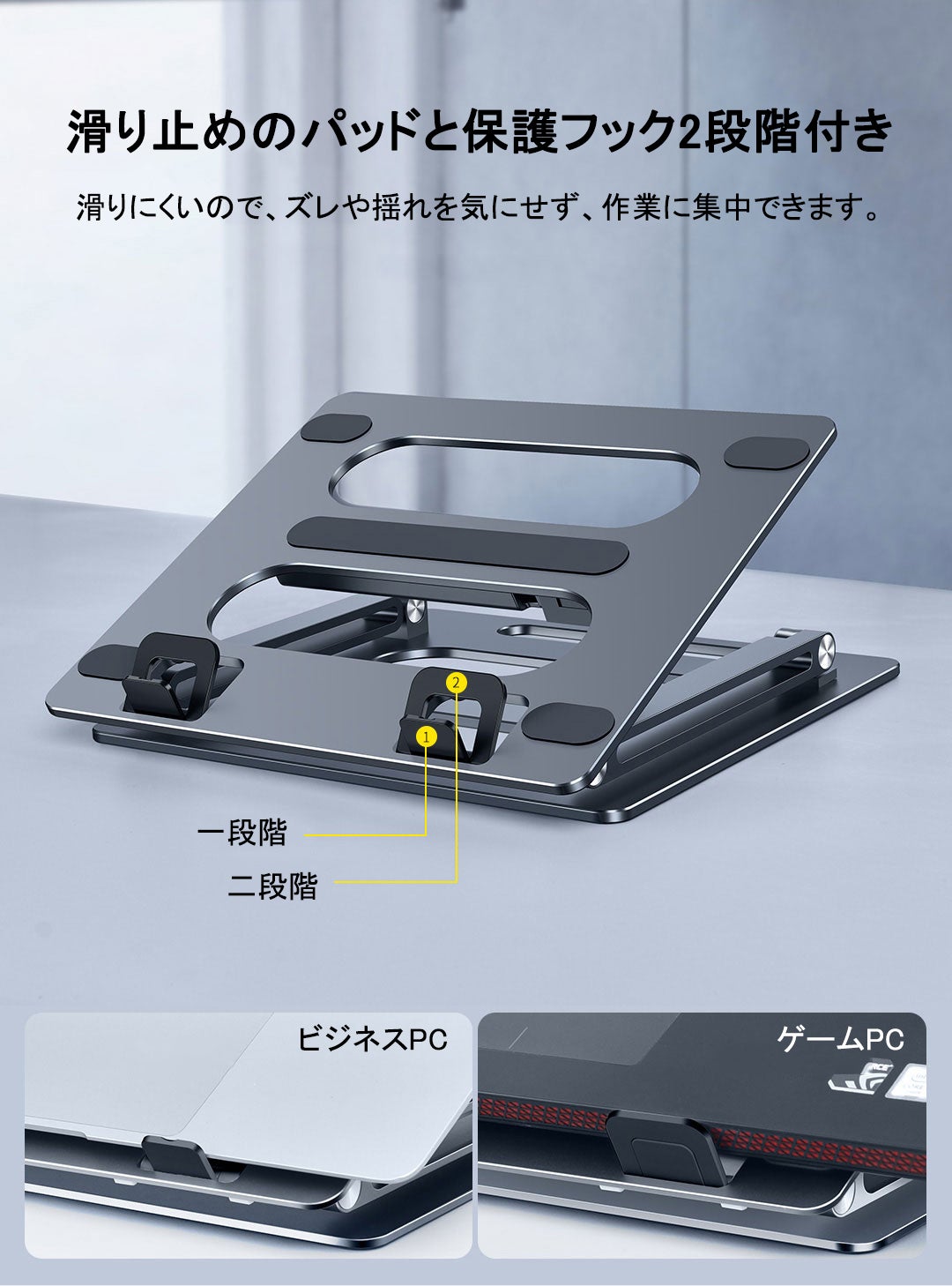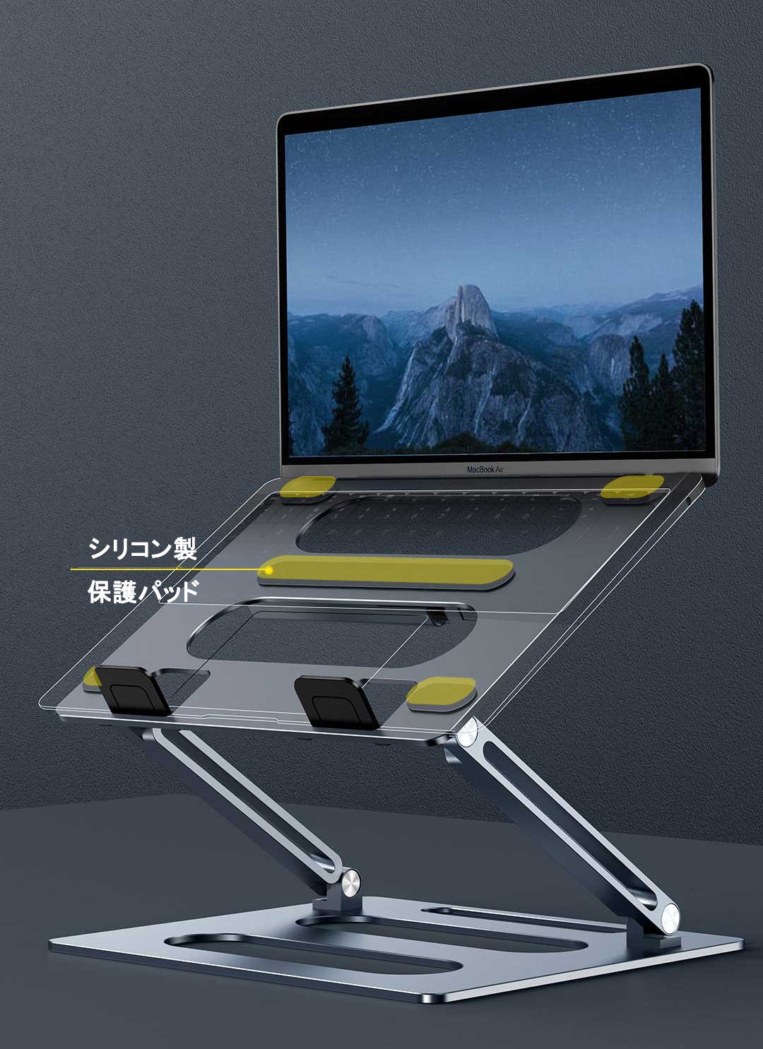 パソコンが当たる部分にはシリコン製の滑り止めゴムが施されているので、パソコンを傷つけにくく、落下の心配もなく、作業ができます。抜群な安定性により、17.3インチまでのノートPCやタブレットにも対応可能。