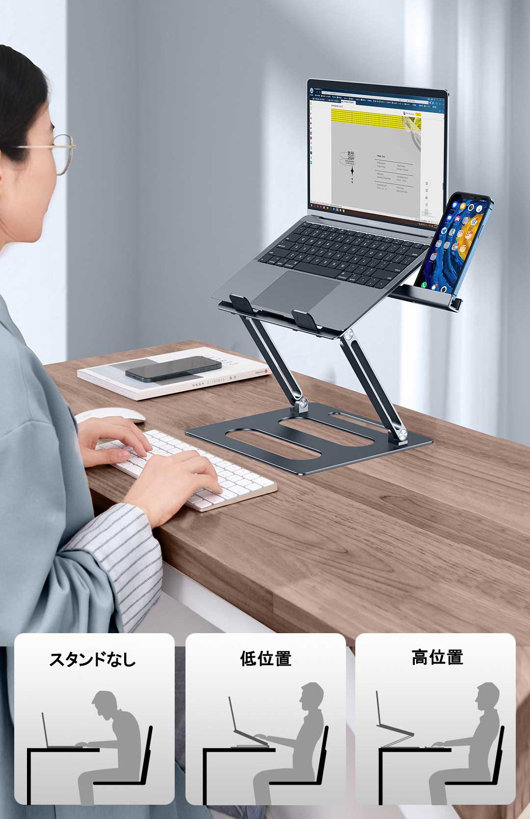 長時間ノートPCを直接デスクに置いて作業を行うと、姿勢が悪くなり首や肩などによくありません。また、ノートPCを長く使用していると、熱暴走により、速度が遅くなったり、フリーズしてしまったり、それだけではなくノートPCの寿命を縮めてしまう恐れがあります。