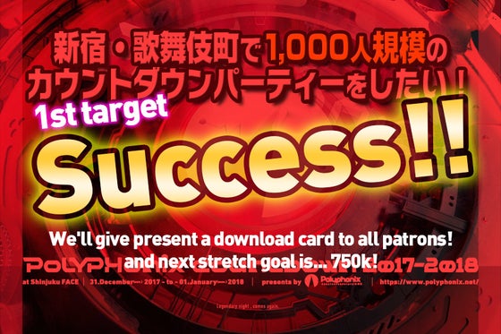 Polyphonix Countdown2017-2018クラウドファンディングプロジェクトが先程目標金額50万円に到達し達成率100%になりました!!こんなに早くプロジェクトがSUCCESSするとは正直思いませんでした。。ご支援、ご協力頂いた皆様本当にありがとうございます! 達成率100%に到達しましたのでご支援頂いた皆様全員にPolyphonixスペシャルダウンロードカードをプレゼント致します。 また、プロジェクトはSUCCESSしましたが次の目標と致しましてストレッチゴールを実施致します! 75万円達成…・スペシャルダウンロードカード楽曲にさらに1曲追加! 100万円達成…・イベント当日のPolyphonix Live Set音源を支援者全員にプレゼントイベント当日のPolyphonixのLive Setを音源にして後日支援者全員にデータでプレゼント致します。 125万円達成…・イベント当日のPolyphonix Live Set音源をハイレゾ音源にグレードアップ!イベント当日のPolyphonix Live Set音源を高音質のハイレゾ音源(24bit,48kHz)にグレードアップ致します。 引き続き、ご支援ご協力の方を宜しくお願い致します!!